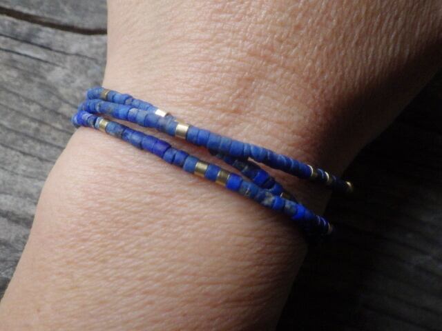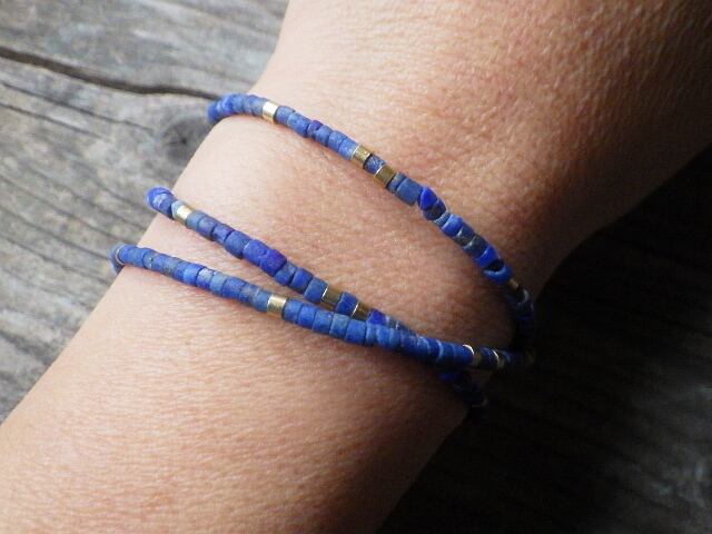 アフガニスタン産の深いブルーのラピスラズリの極小ヒーシービーズに真鍮のゴールドヒーシービーズを散りばめて、