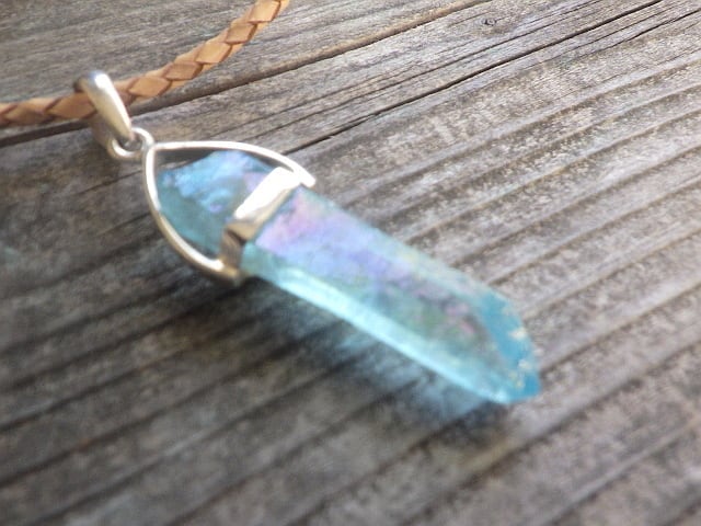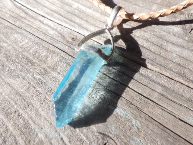 sv925 Aqua aura quartz necklace アクアオーラ原石ポイントの革紐ネックレス