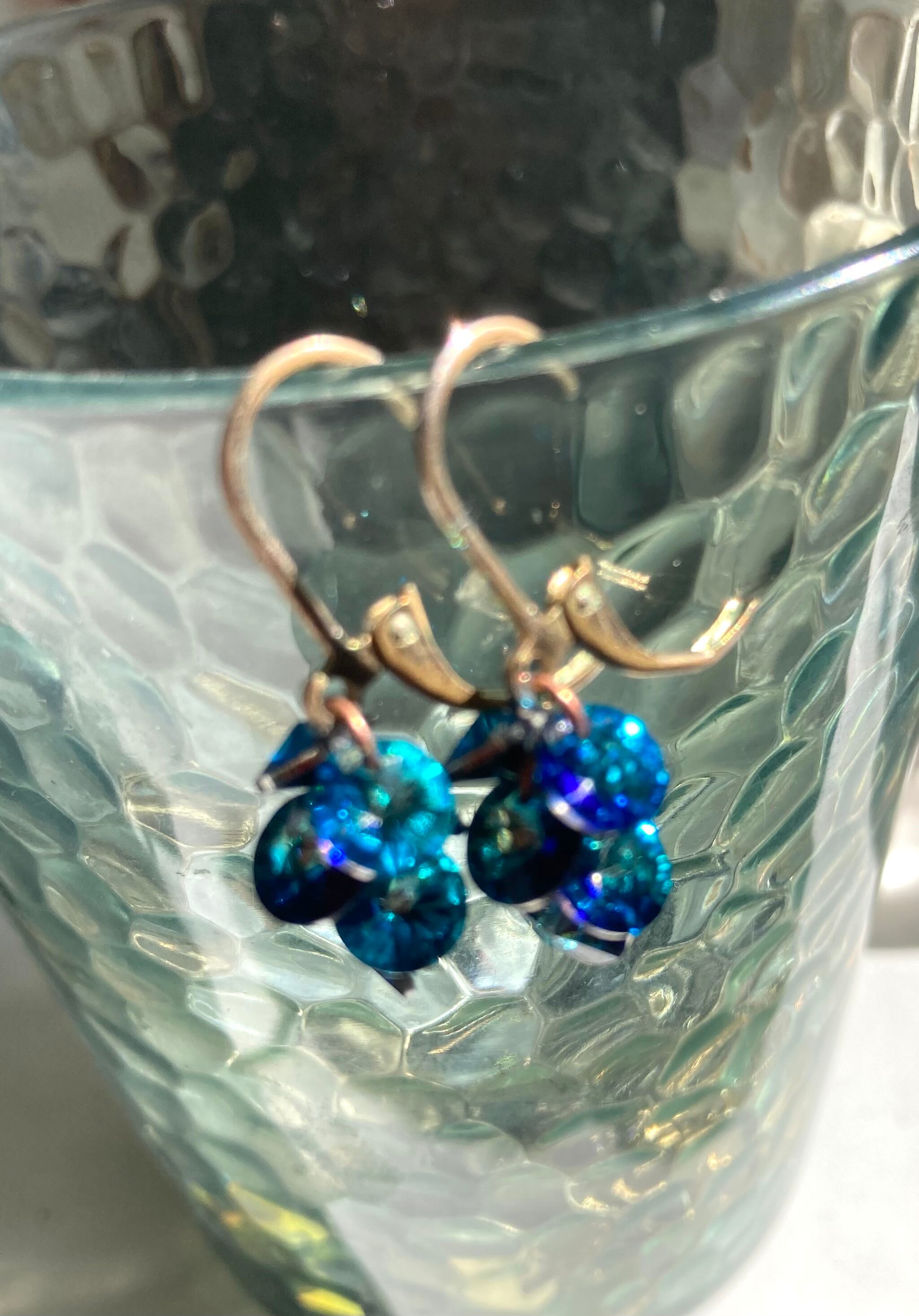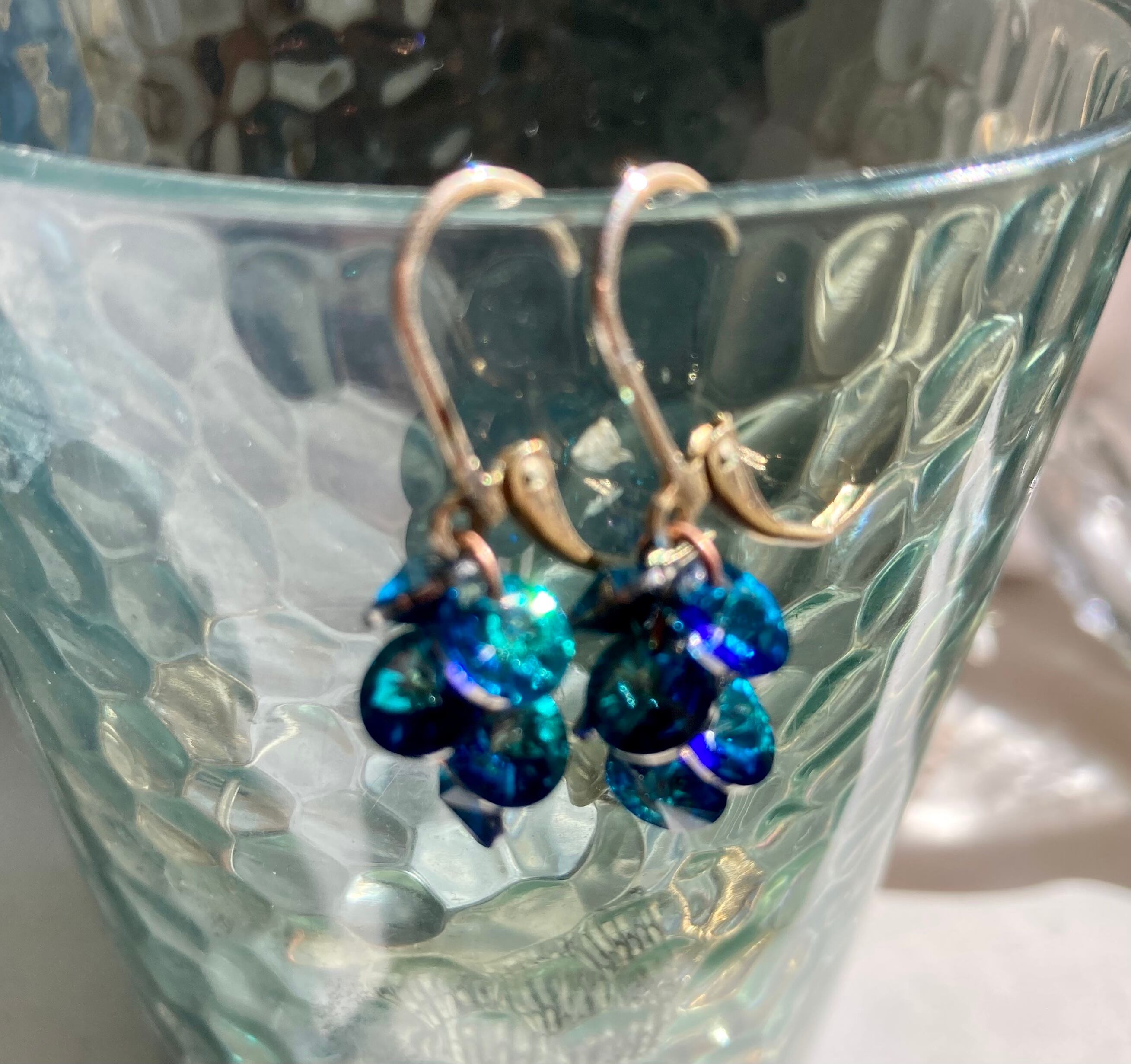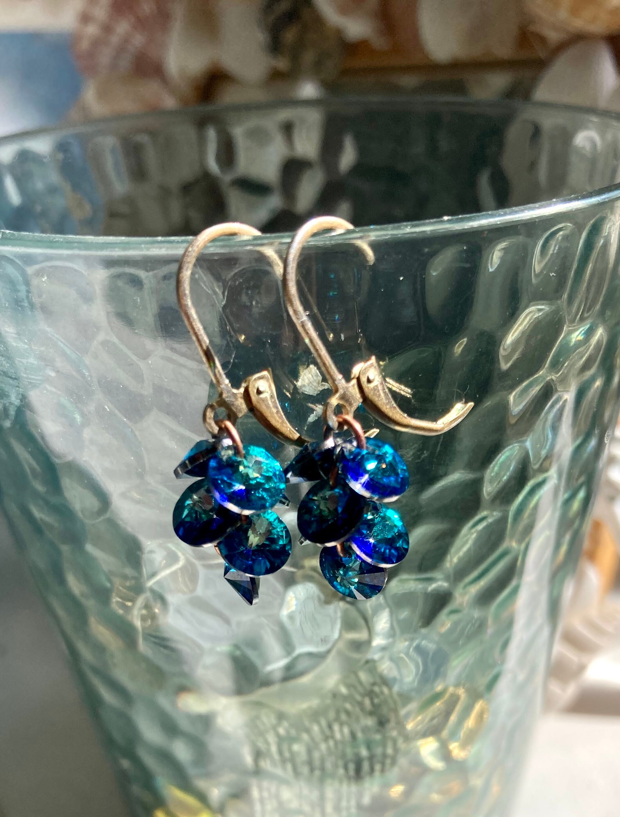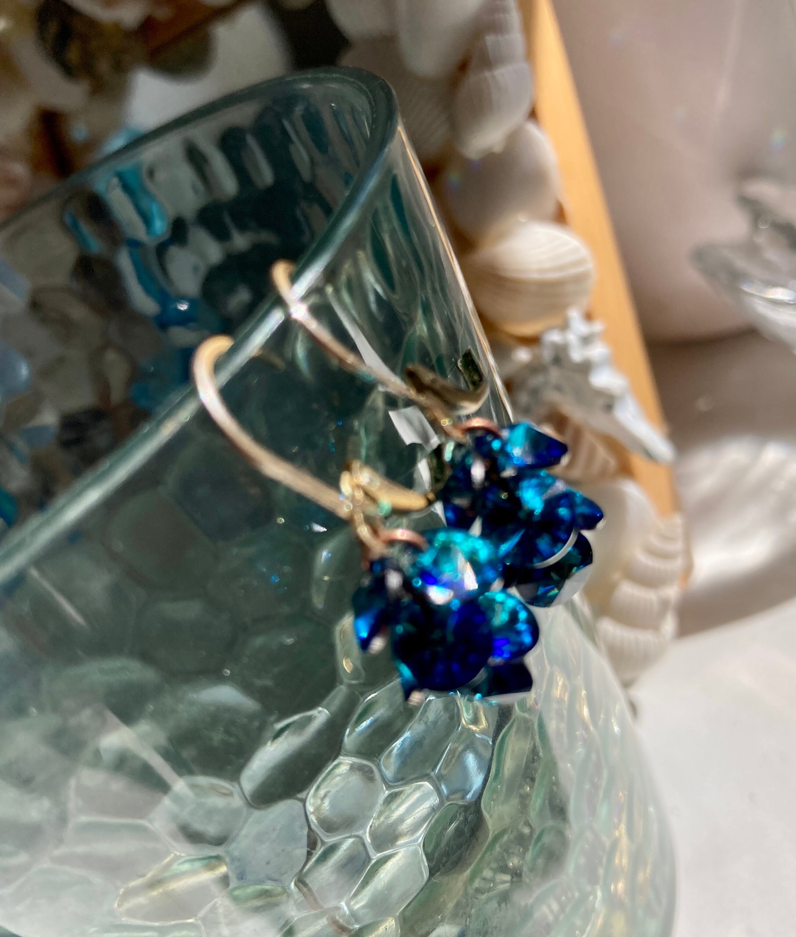 深い海を思わせるバミューダブルーのスワロフスキーが、光を受けて神秘的に煌めくピアスです。