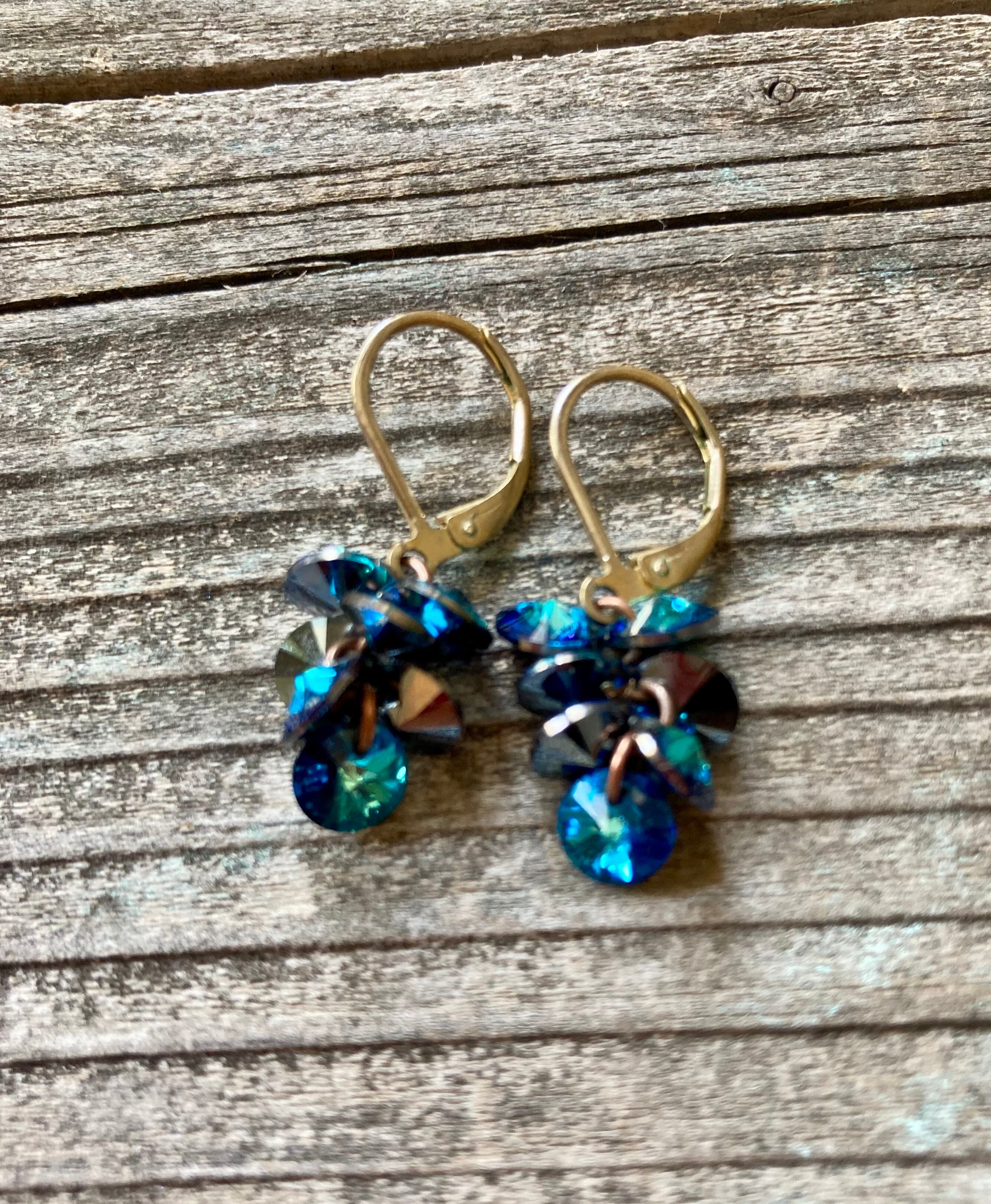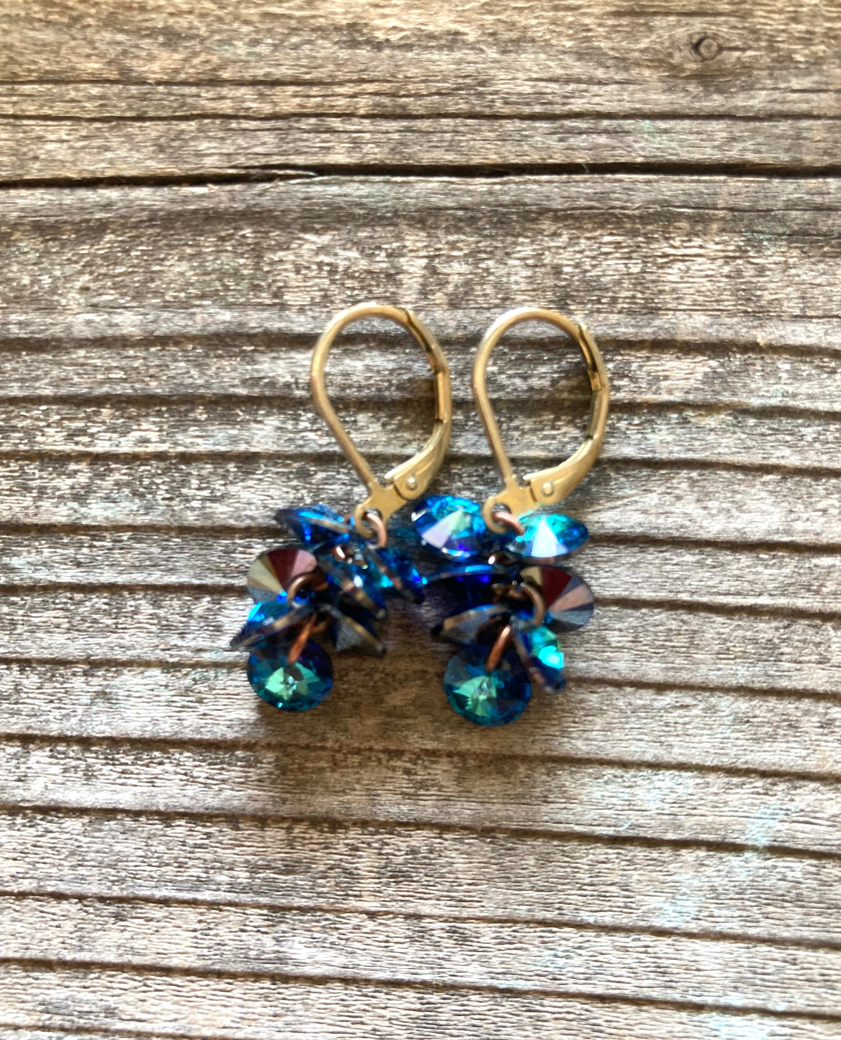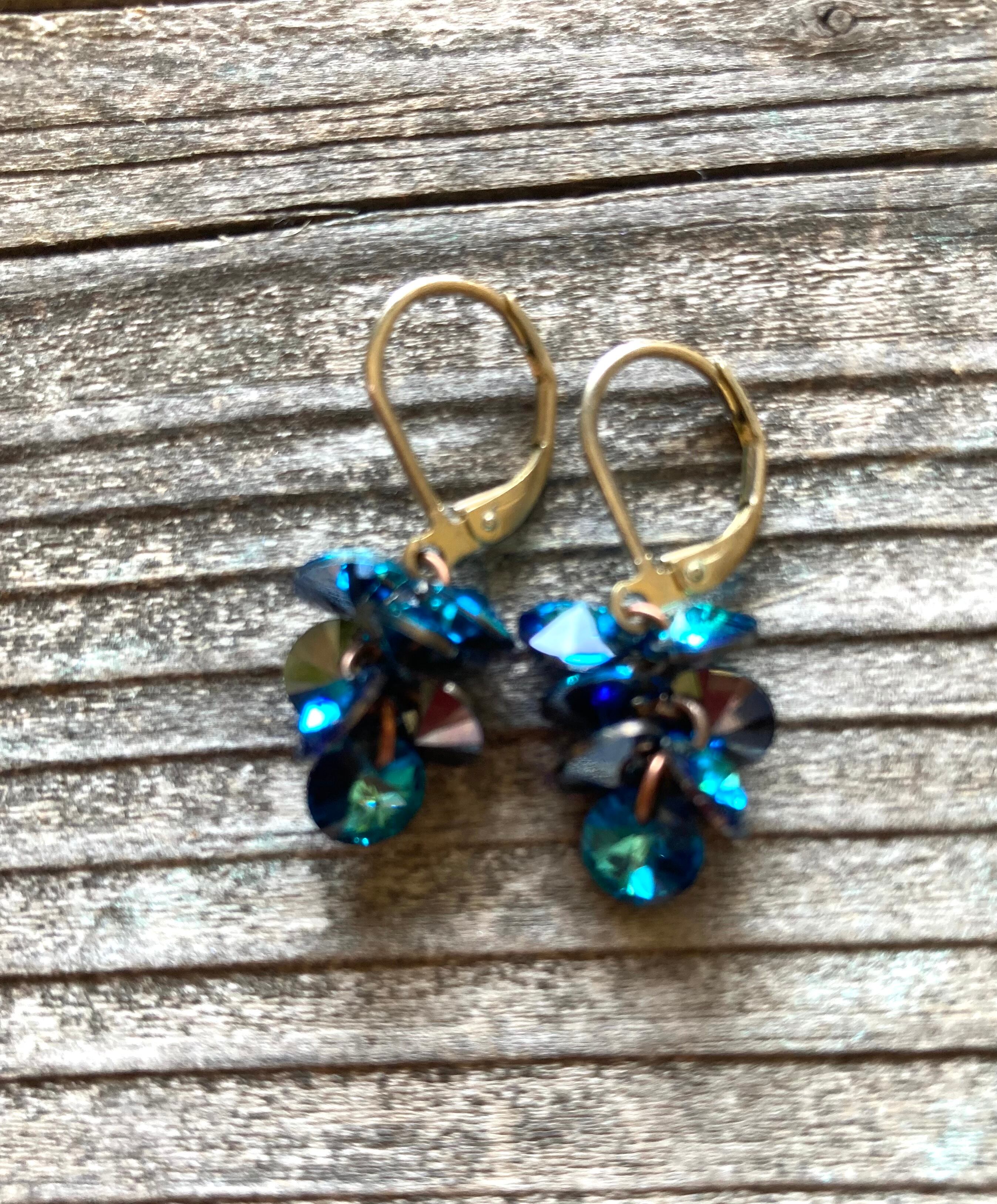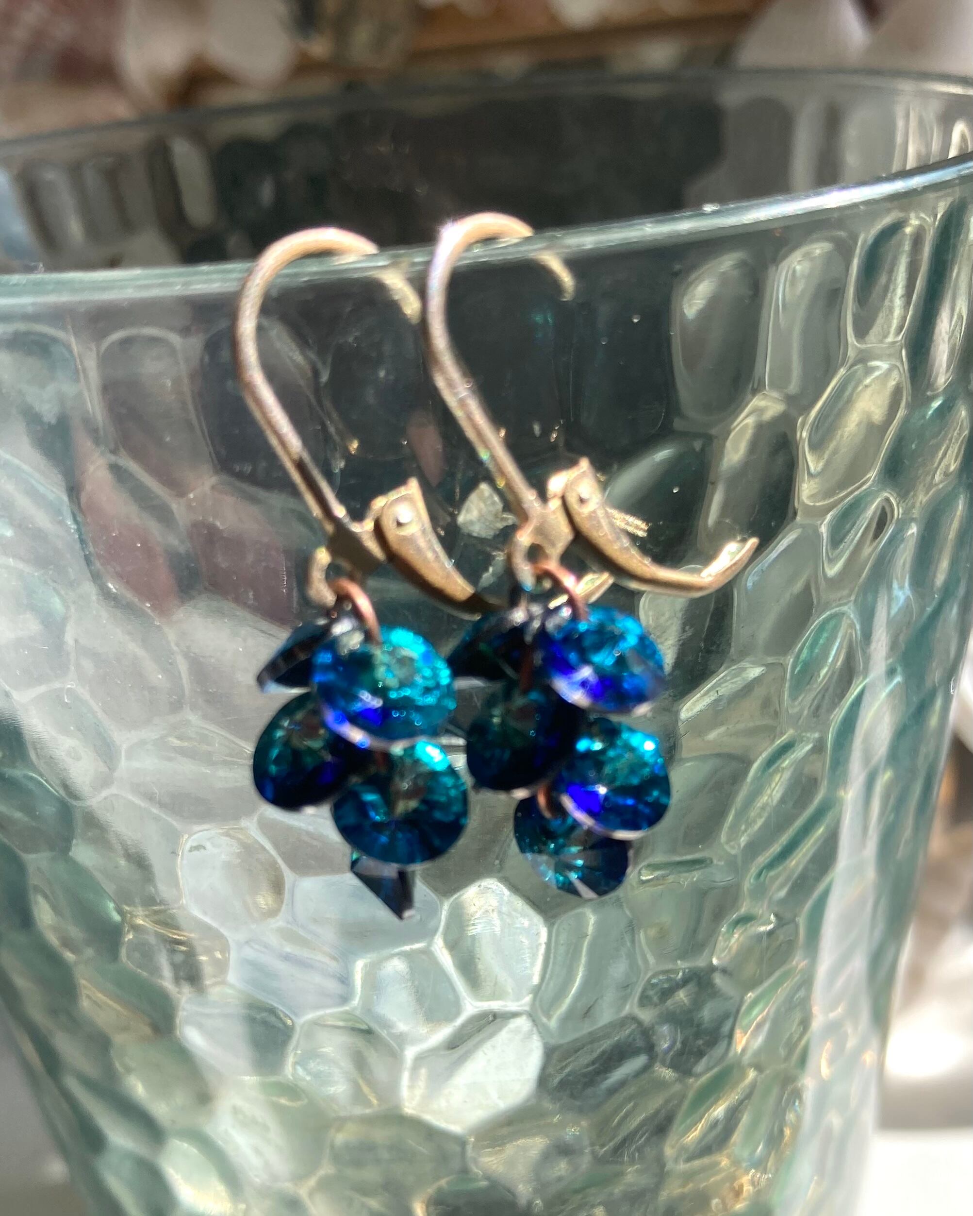 深い海を思わせるバミューダブルーのスワロフスキーが、光を受けて神秘的に煌めくピアスです。