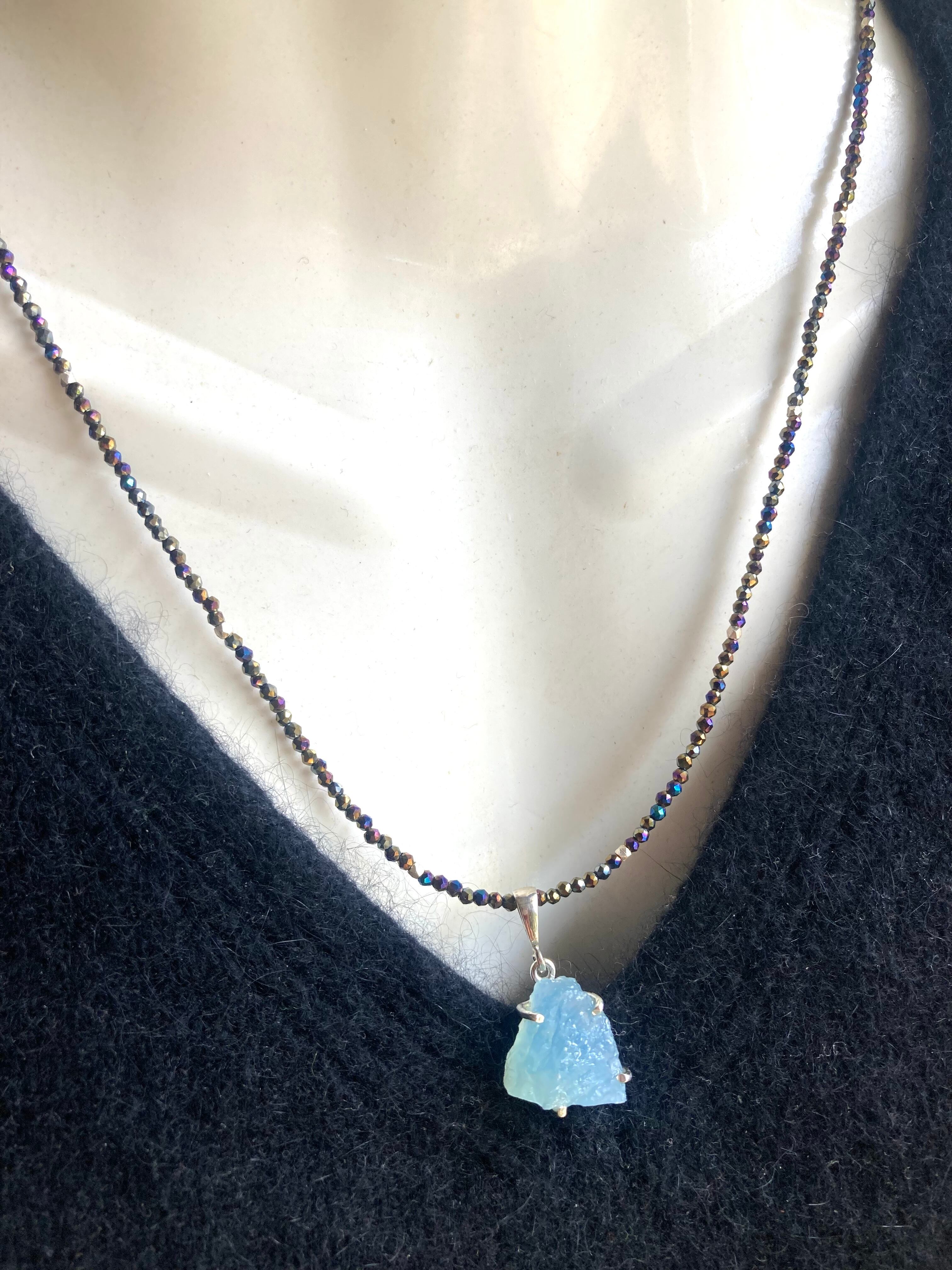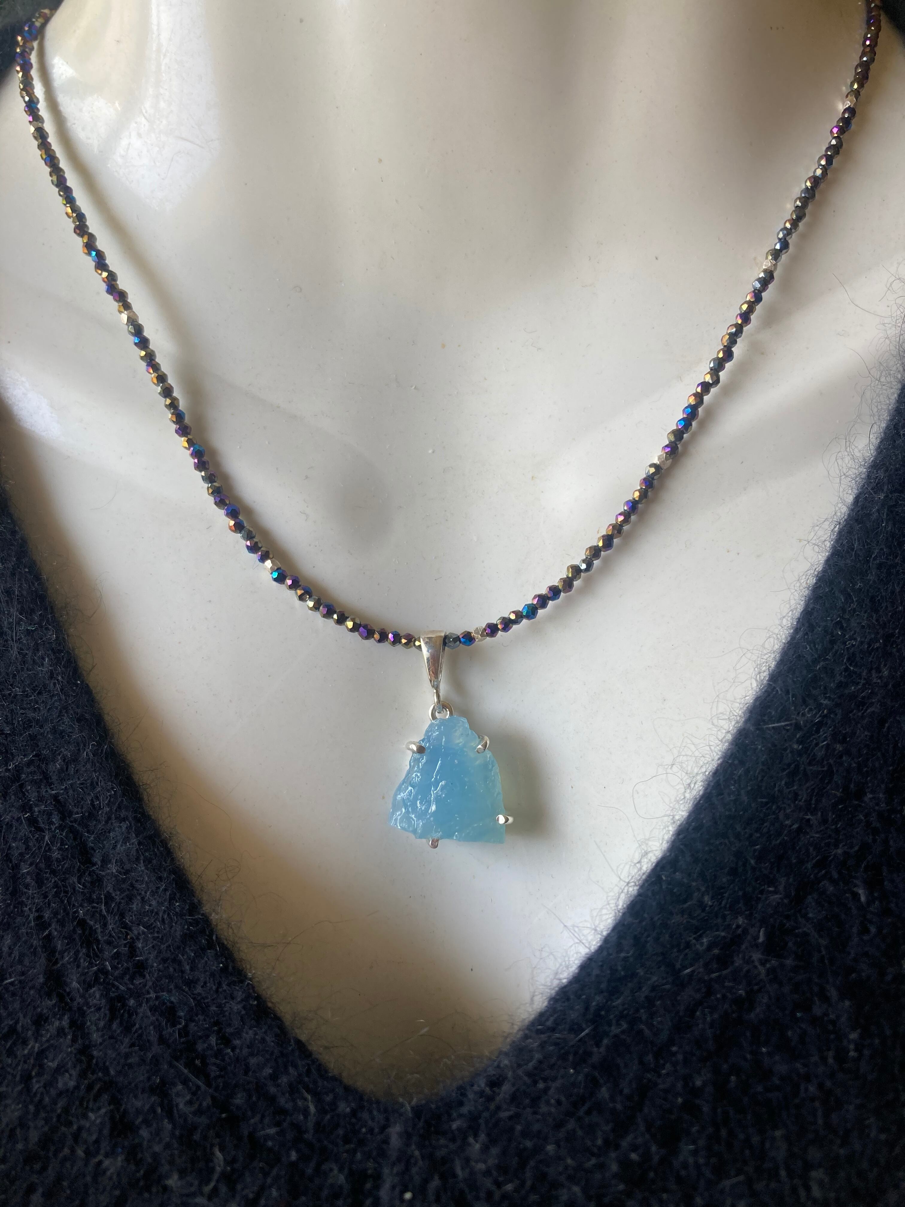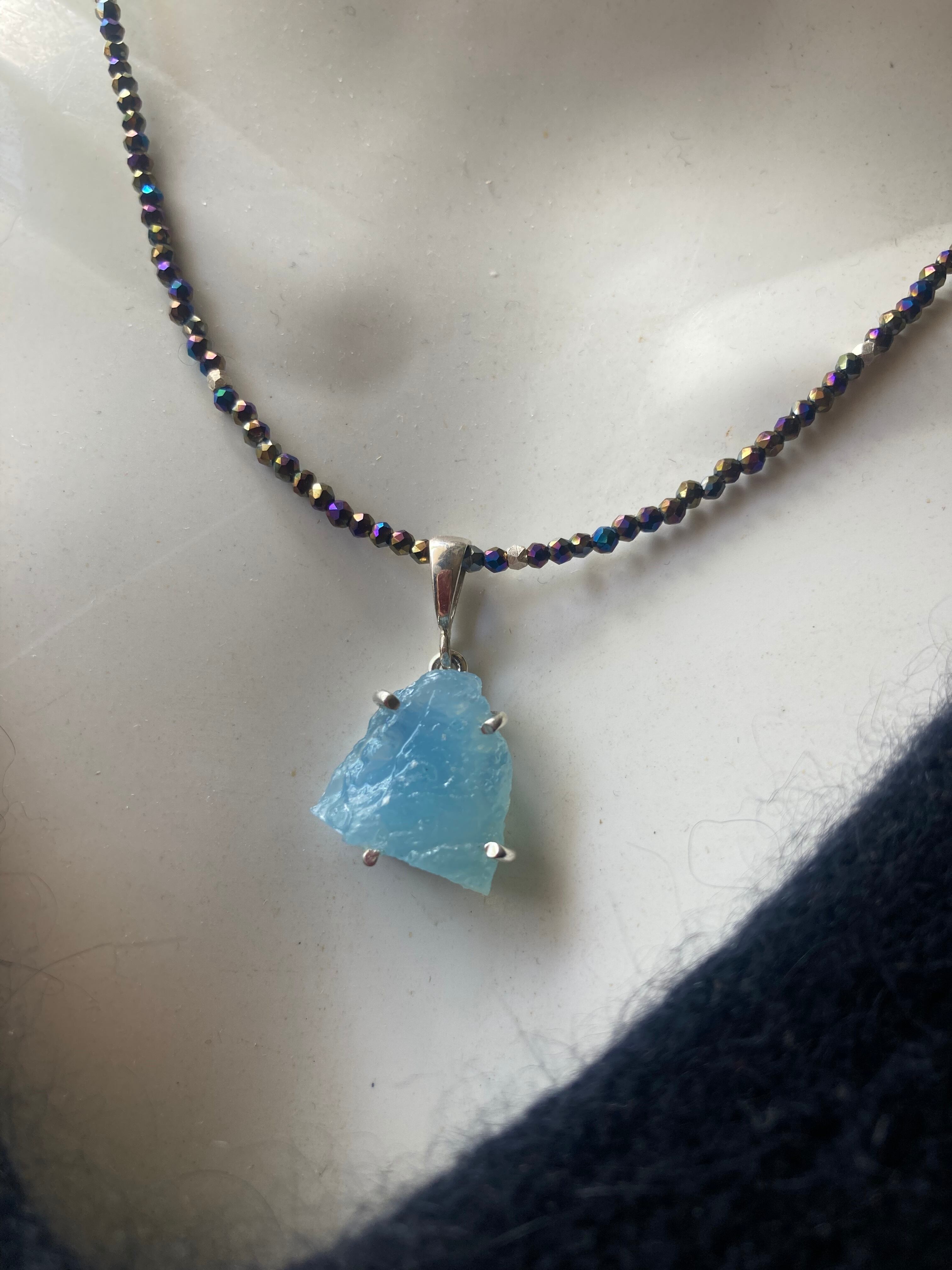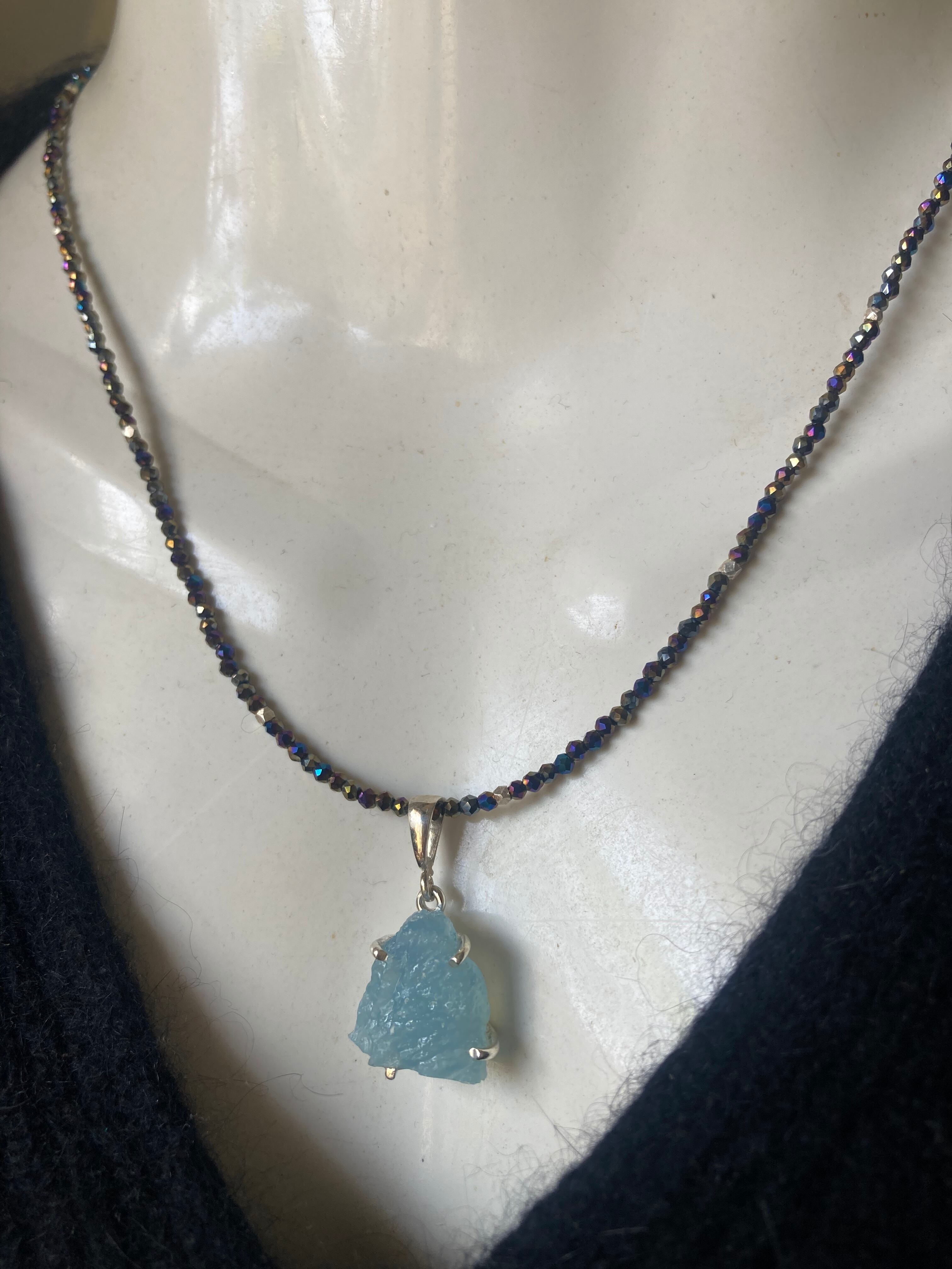 sv925☆Rough Aquamarine ラフロック アクアマリンのブラックスピネルネックレス
