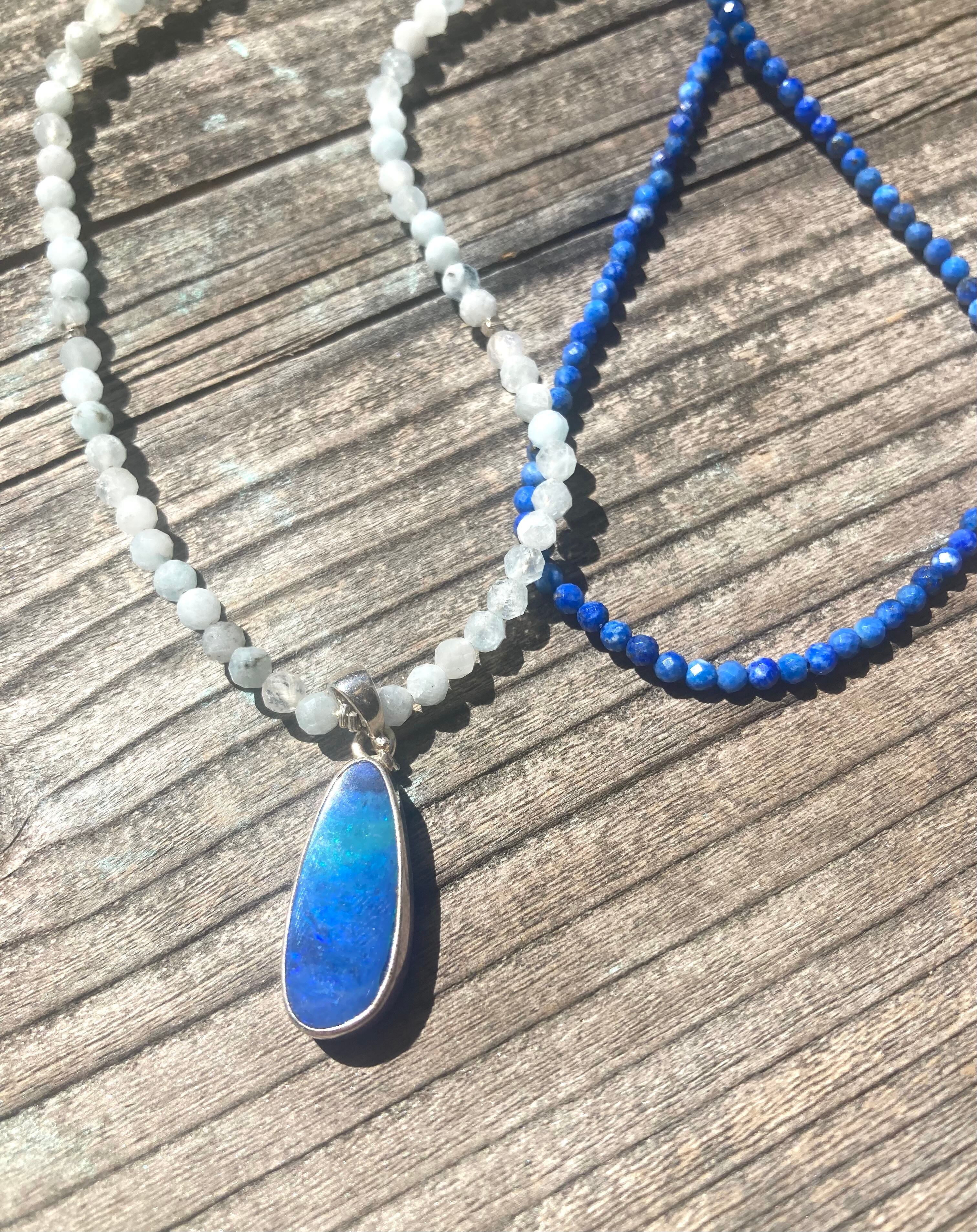 ご希望があれば、深い夜空のような極小ラピスラズリでもお作りできます。マリンブルーの深みがオパールの海色と相性抜群です。