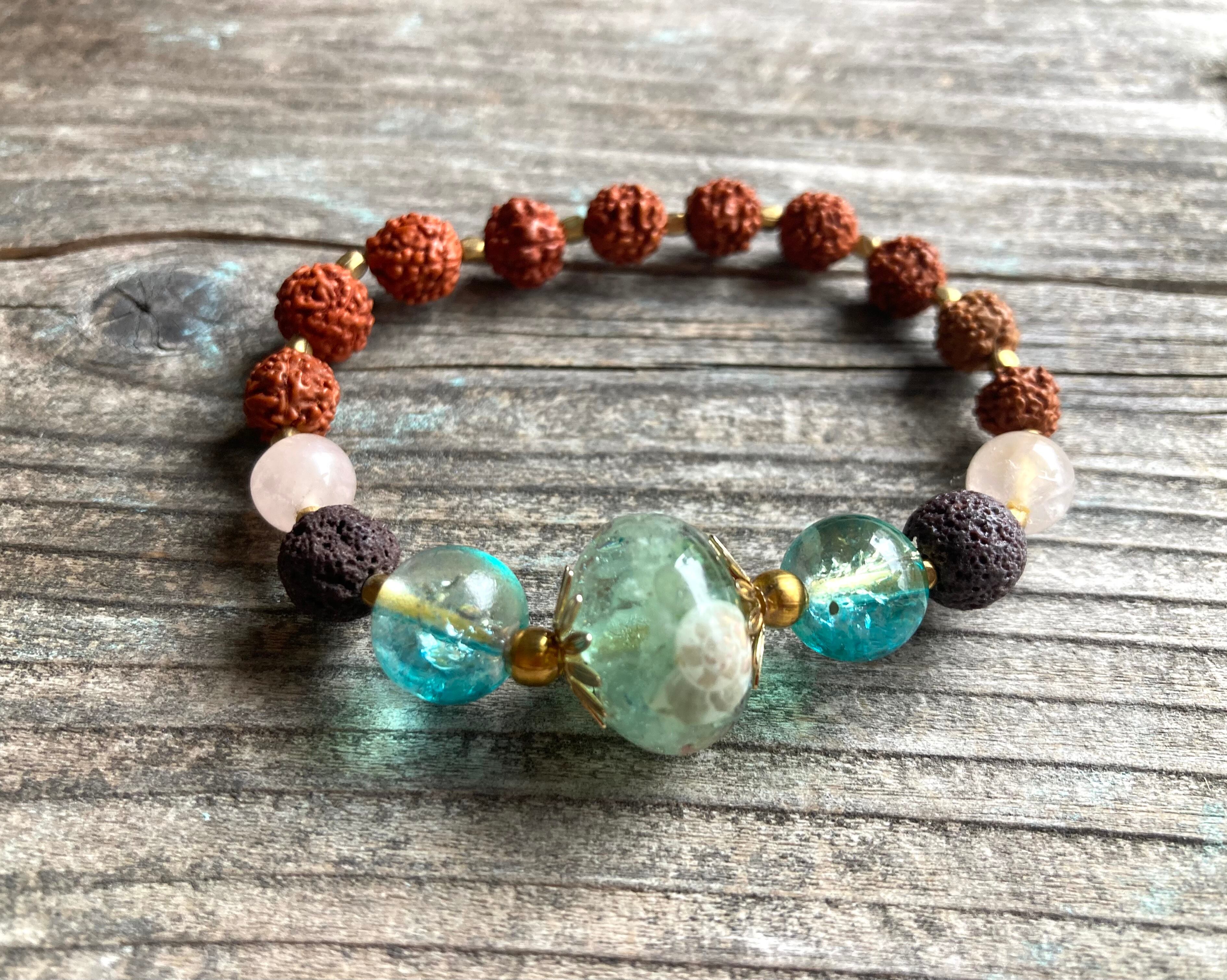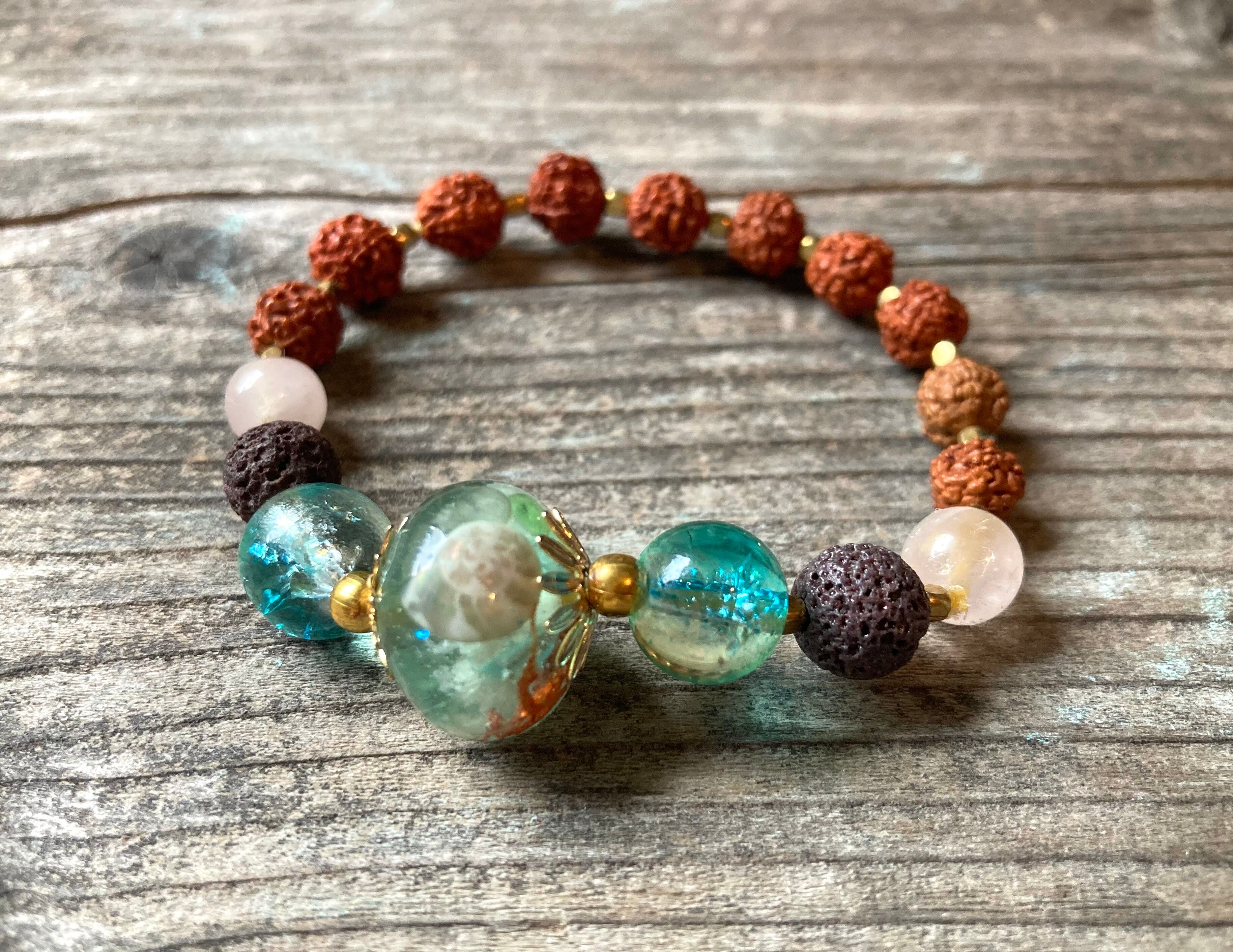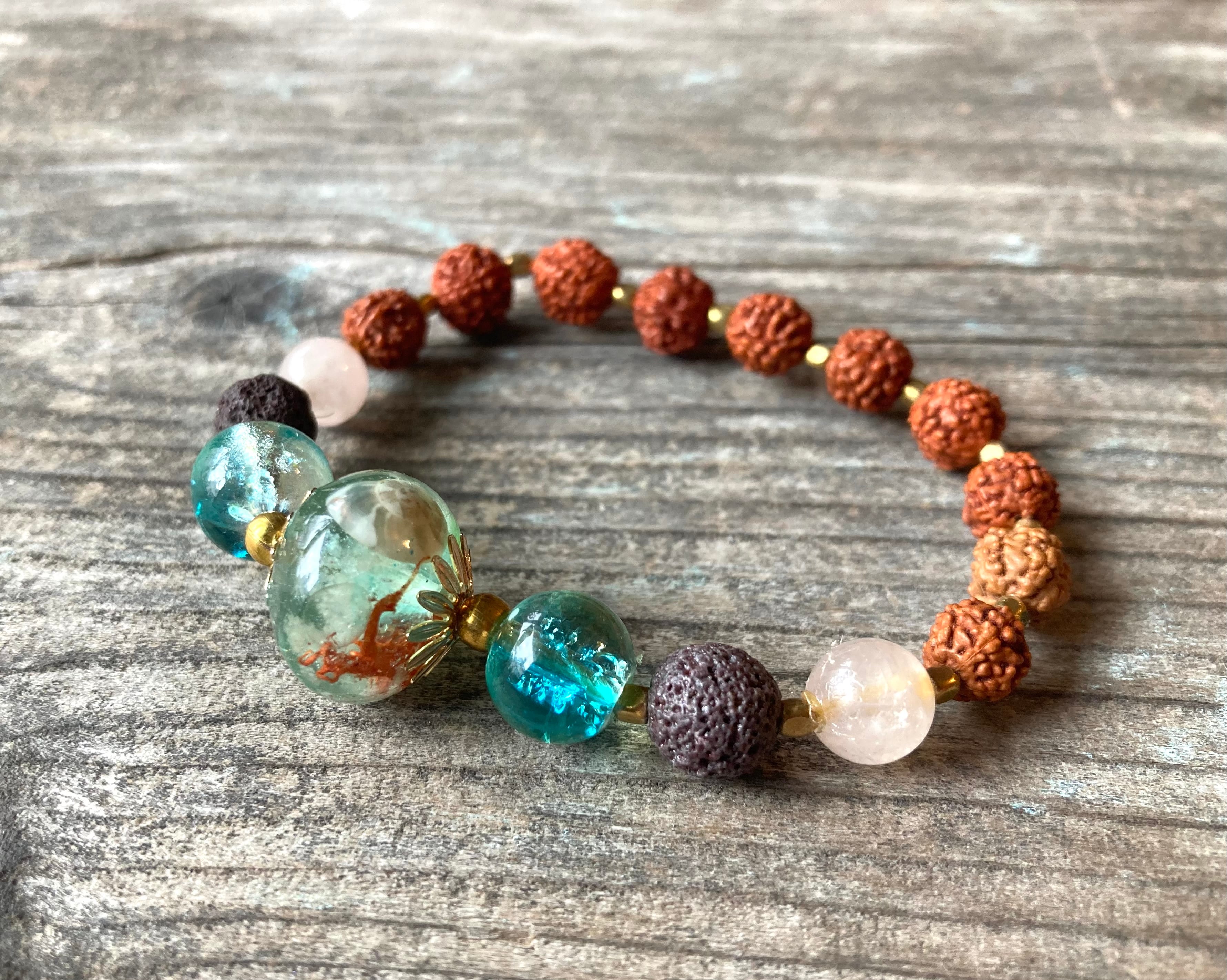 サイドには、大地の生命力を宿した溶岩石(ラヴァストーン)と、海色のヴィンテージガラスビーズ。さらに、ヨガや瞑想で重宝される神聖な菩提樹の実「ルドラクシャ」を組み合わせました。ゴールドビーズの輝きを散りばめることで、ボヘミアンかつリュクスな仕上がりに。