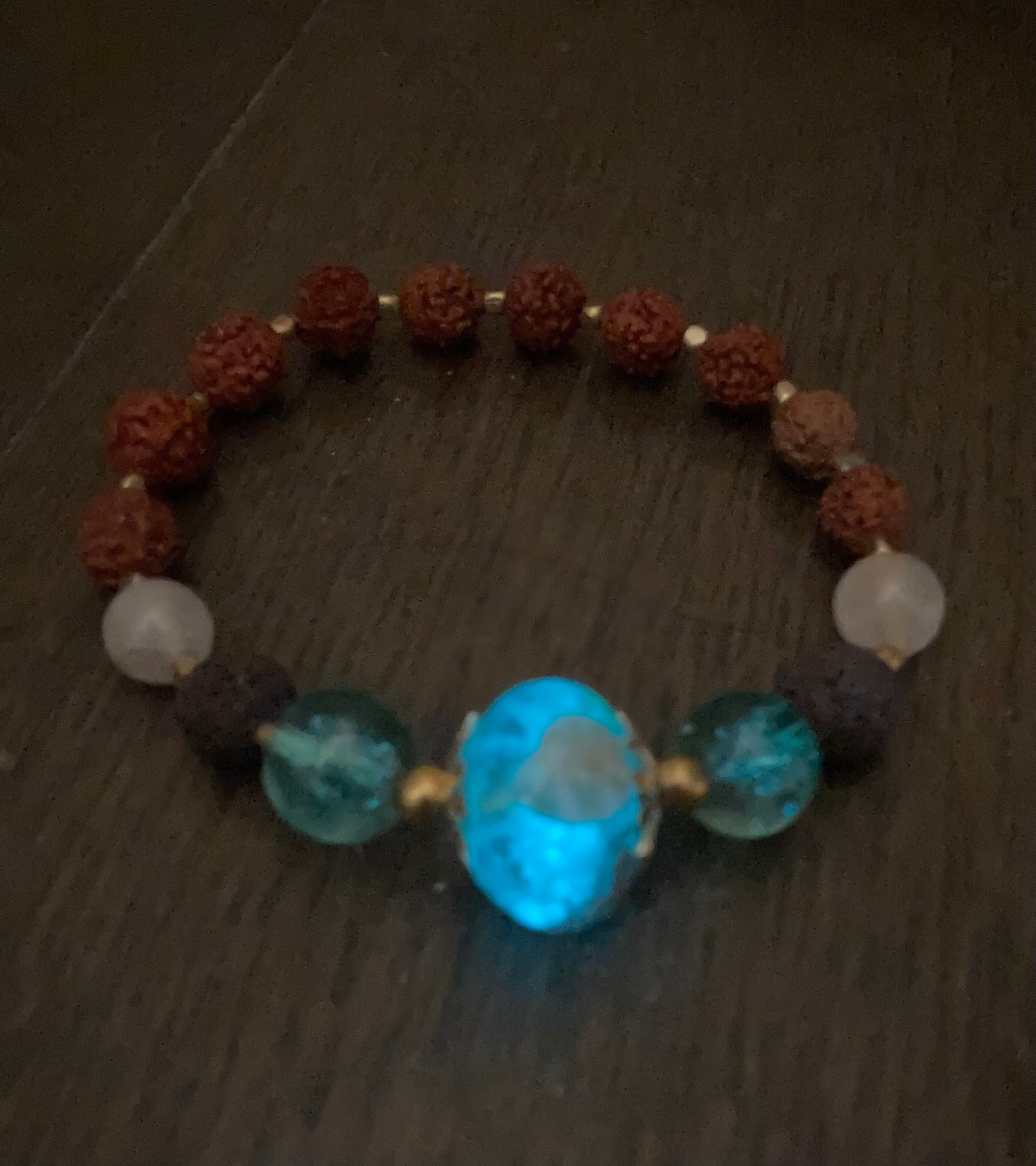 素材: オリジナル樹脂ビーズ(蓄光仕様)、溶岩石(ラヴァストーン)、ヴィンテージガラスビーズ、ルドラクシャ(菩提樹の実)、ゴールドビーズ