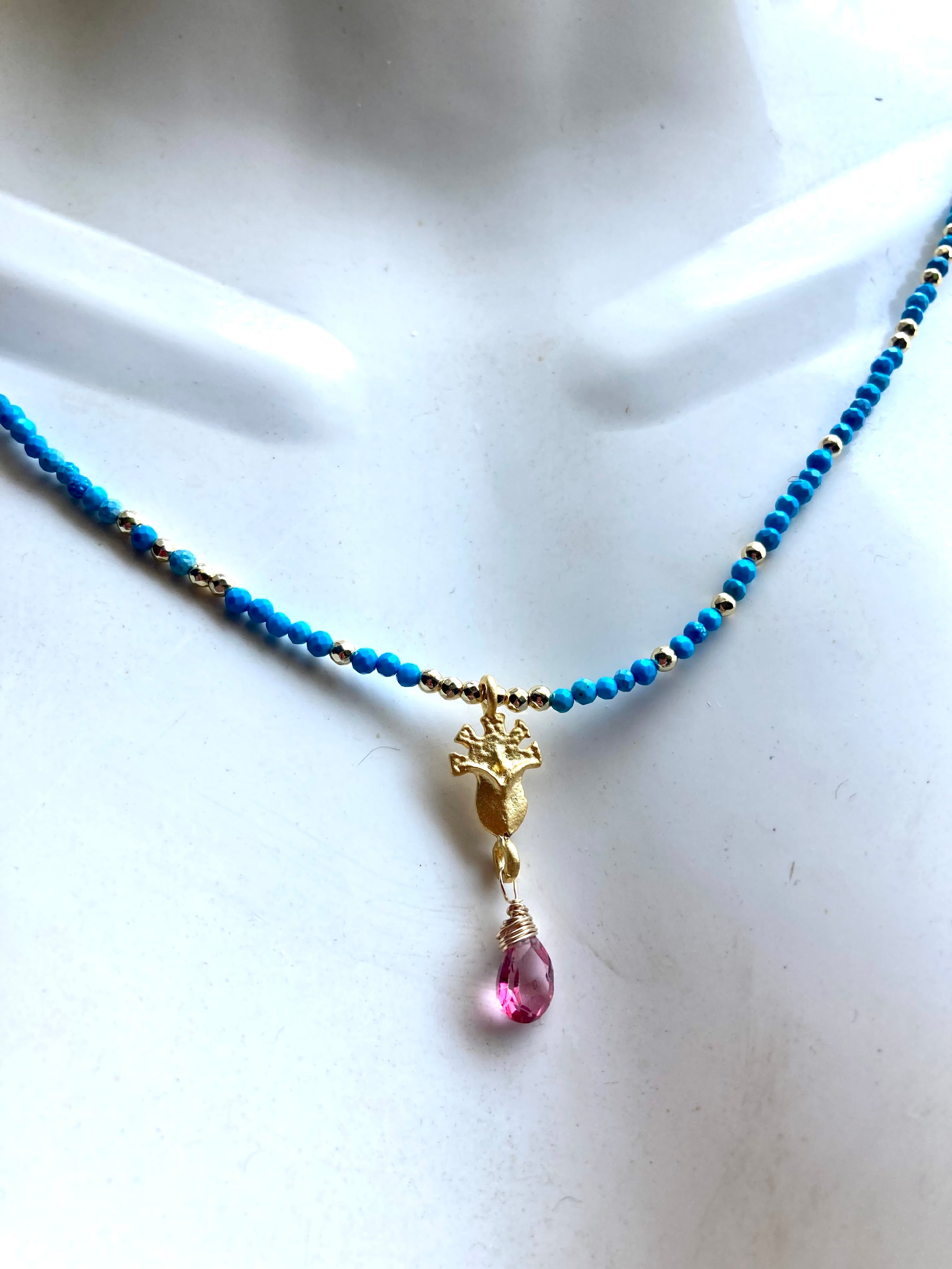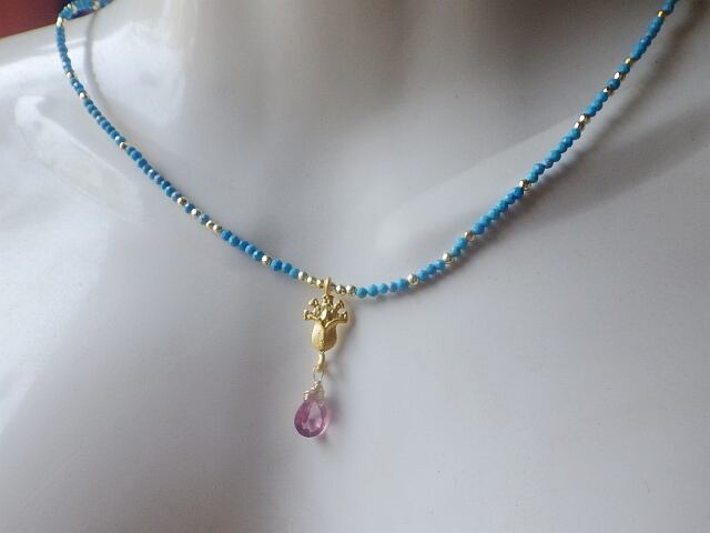 美しい宝石質ピンクトパーズをトップに配し、極小のハウライトターコイズを贅沢に合わせた、エキゾチックでスペシャルな一点が仕上がりました。