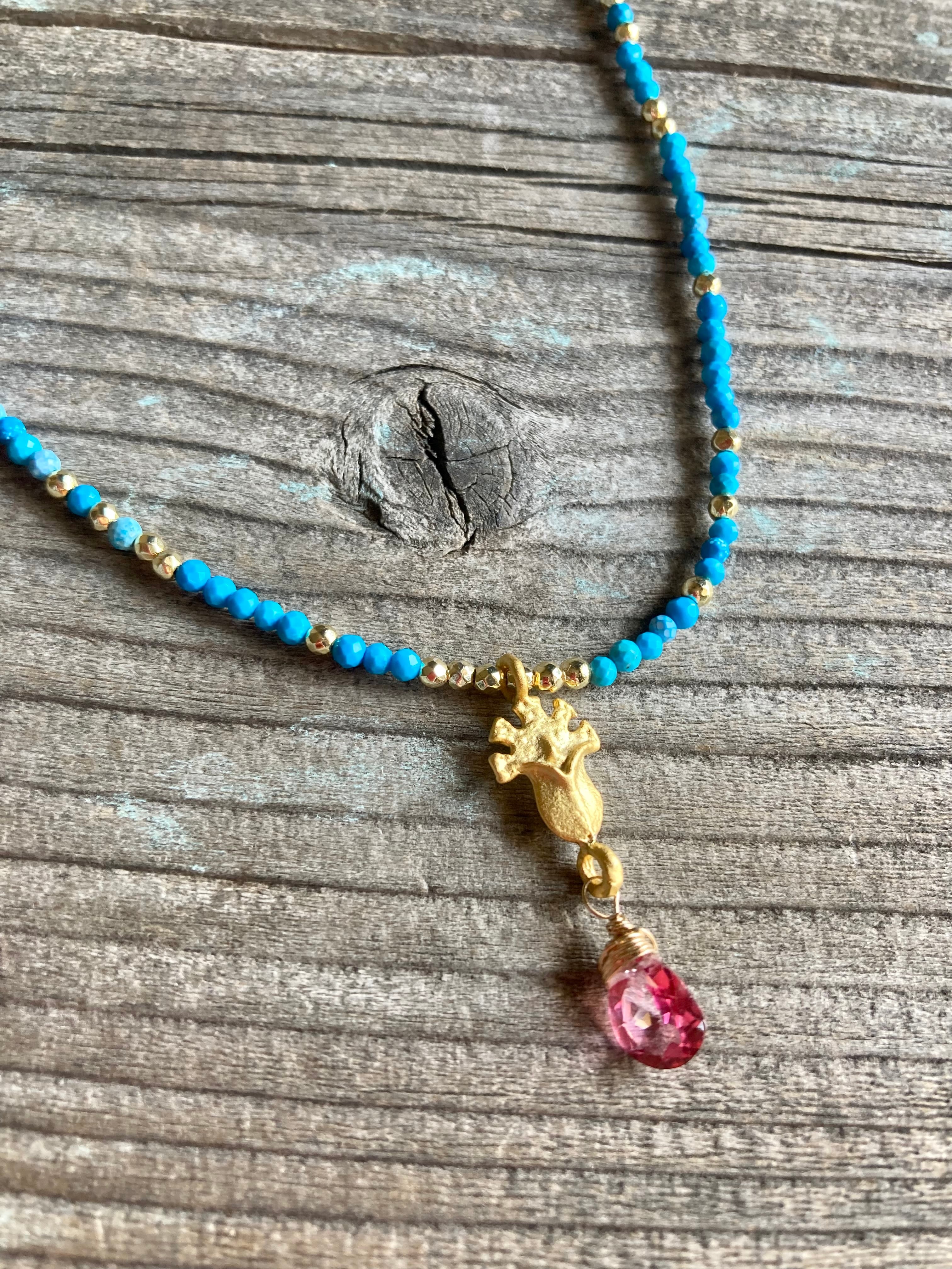 胸元にドラマが生まれる。宝石質ピンクトパーズと海色ハウライトのエキゾチックネックレスです