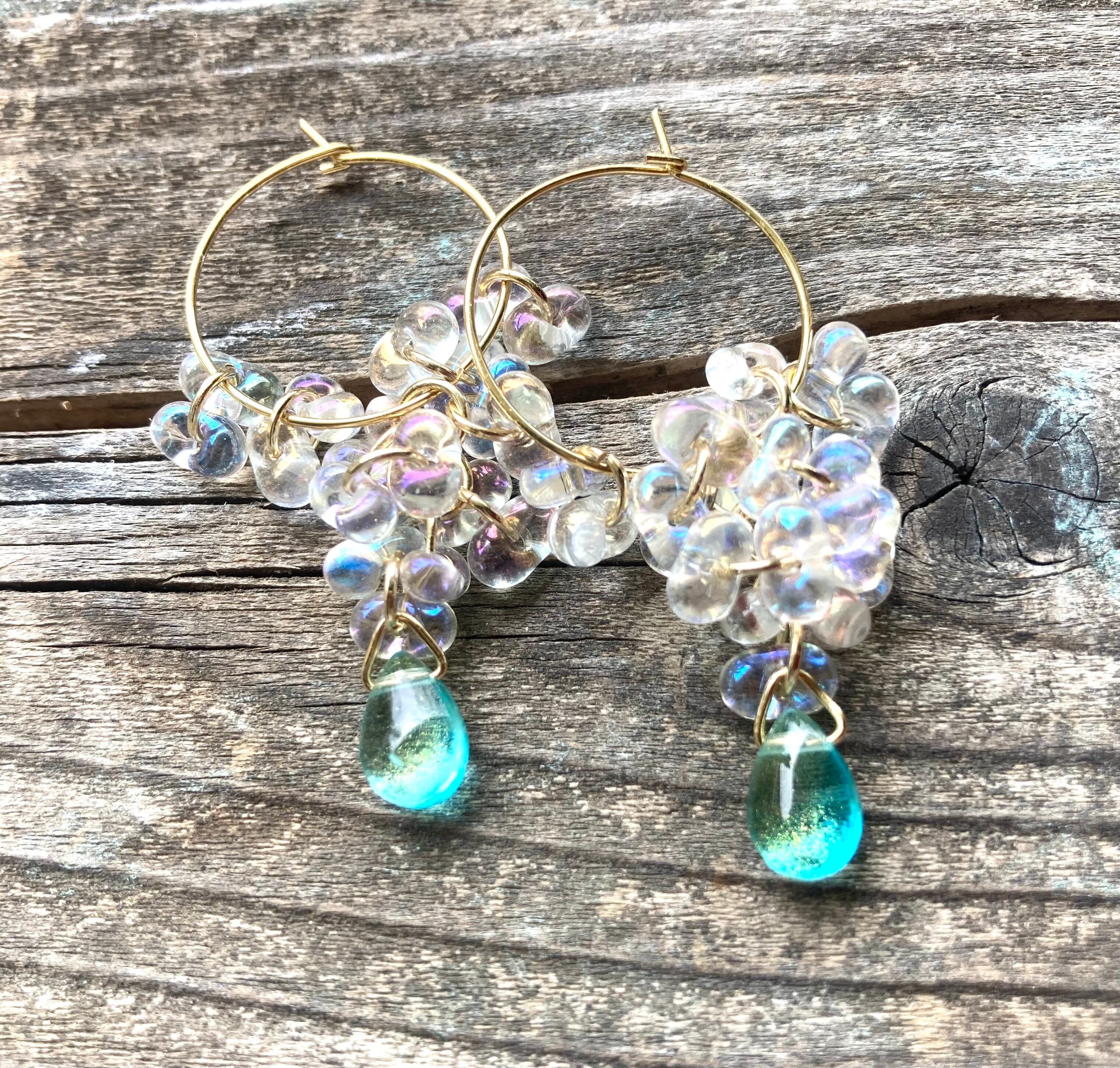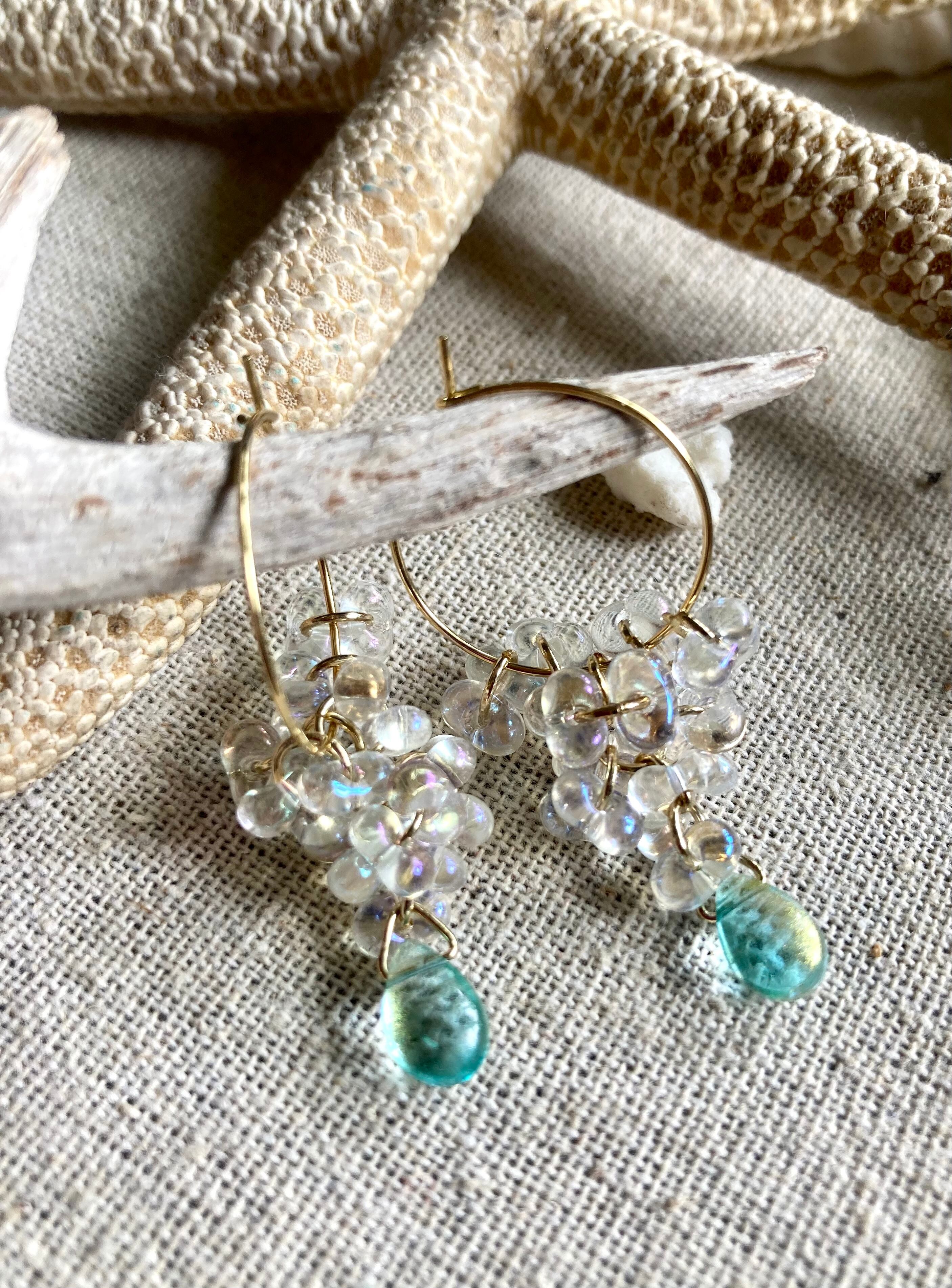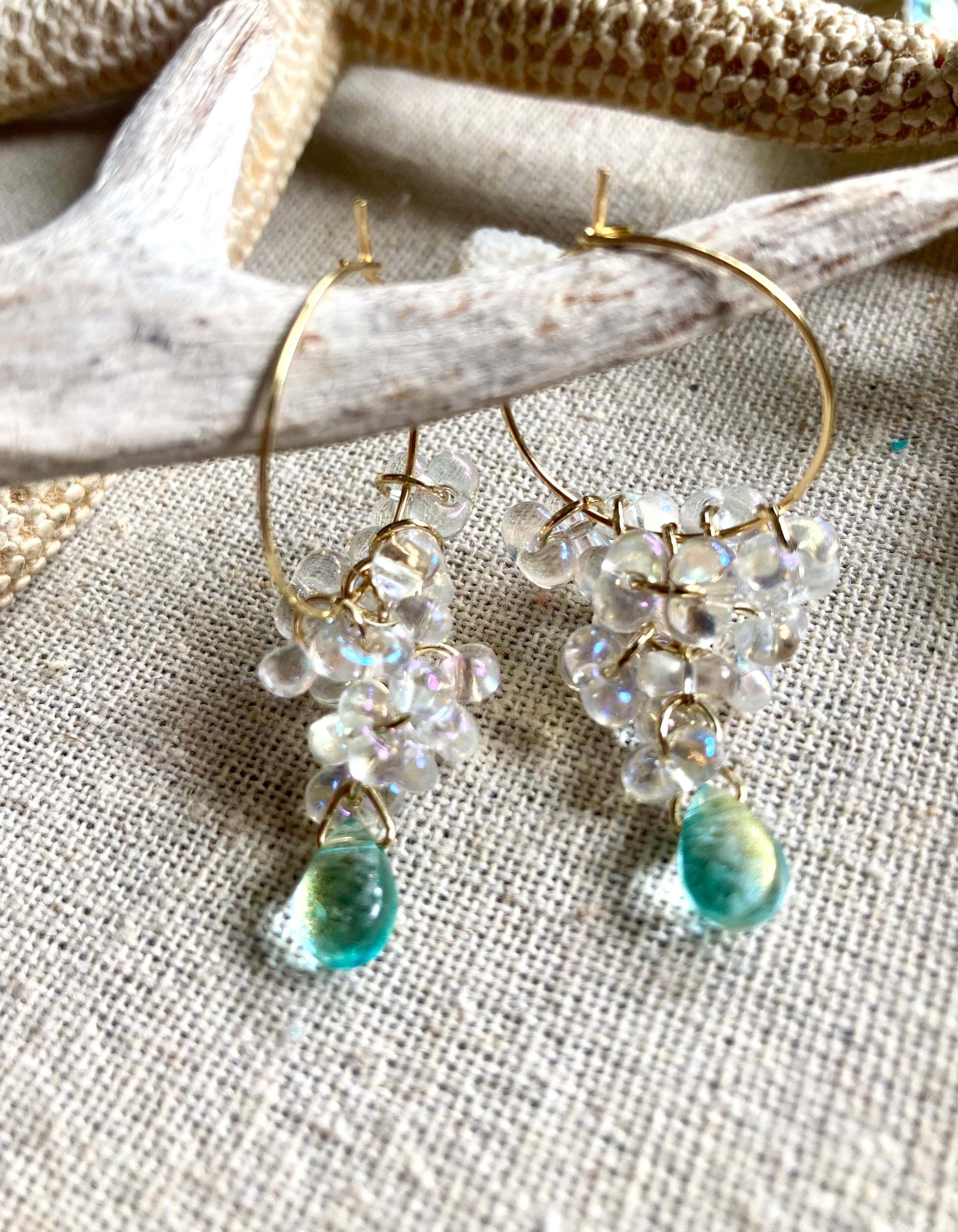 【Water Cascade】水滴つぶつぶガラスと海の雫のフープピアス☆オーロラ