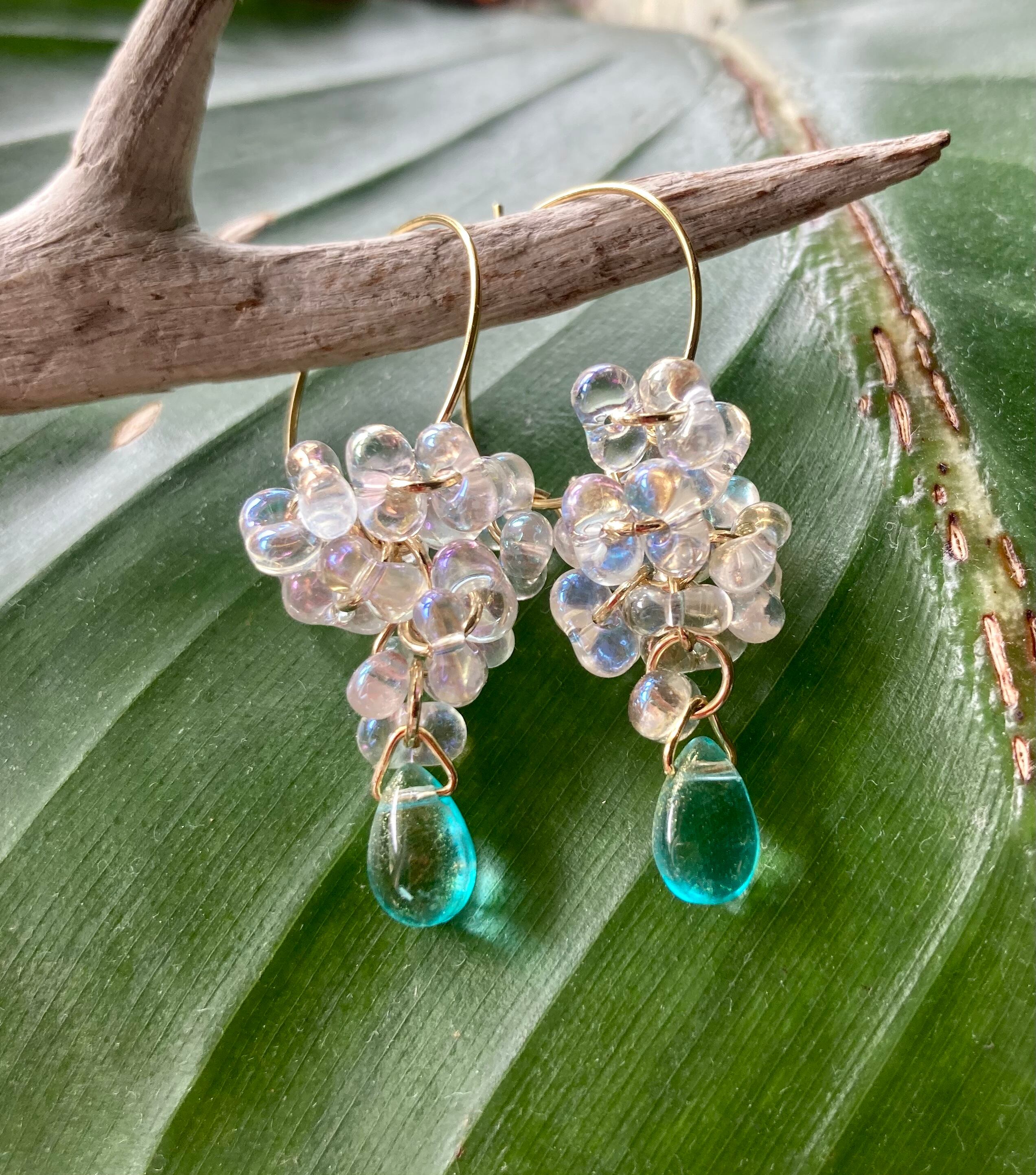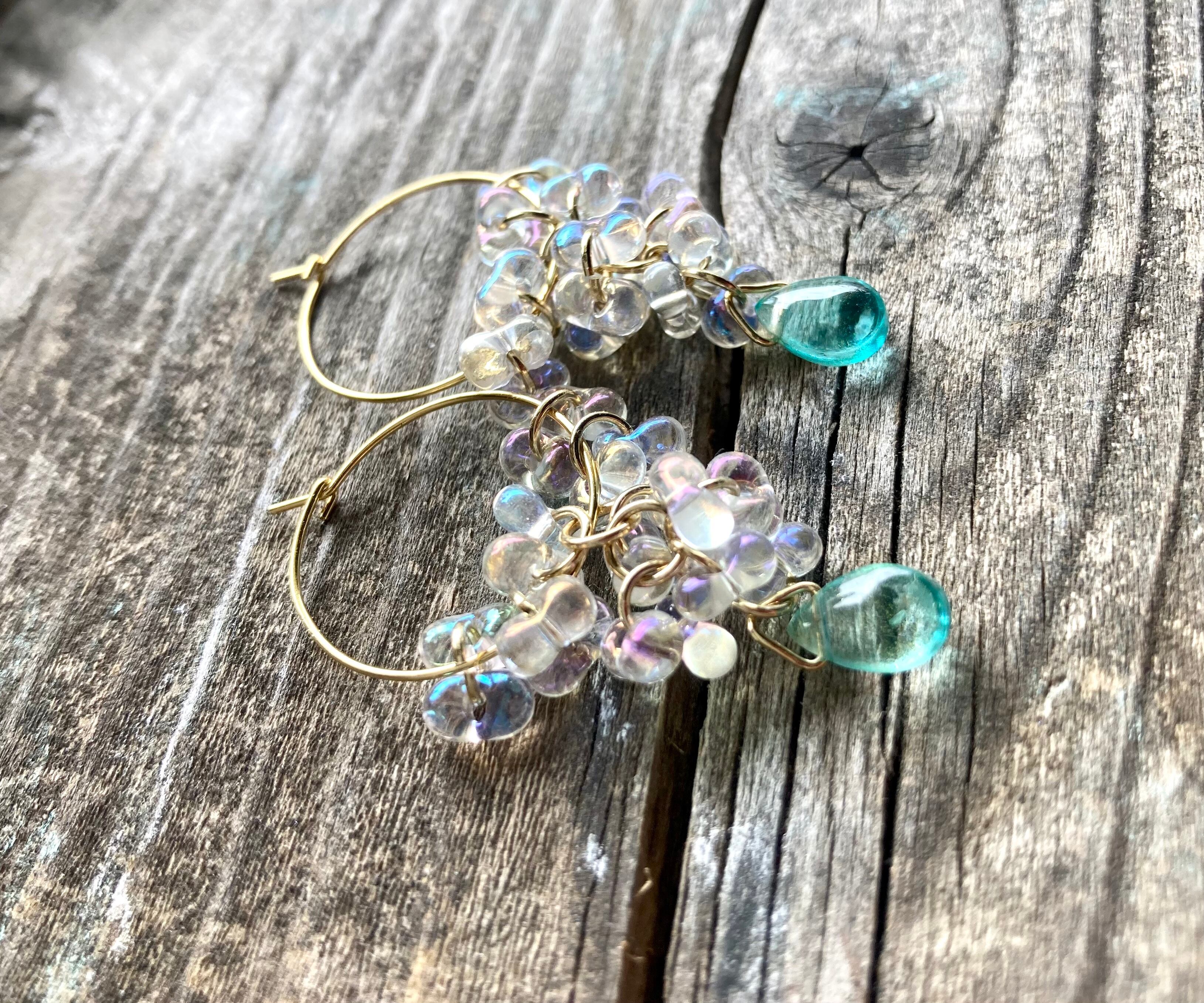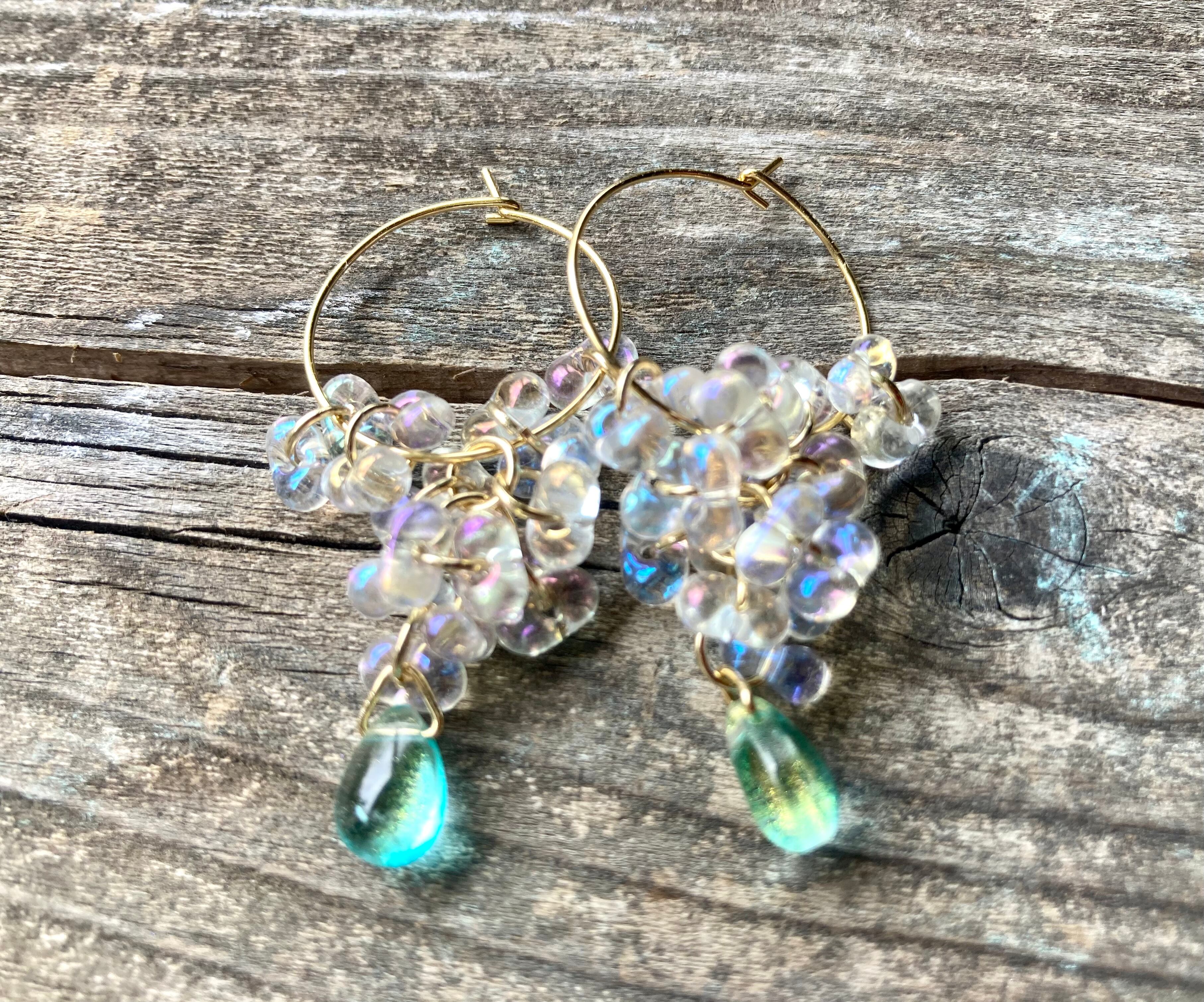 【Water Cascade】水滴つぶつぶガラスと海の雫のフープピアス☆オーロラ