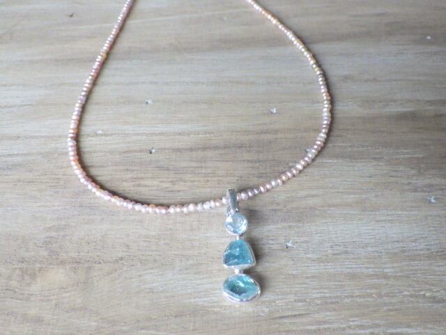 海のようなブルーのアパタイトと薄いピンクの淡水パールのスペシャルなネックレスです