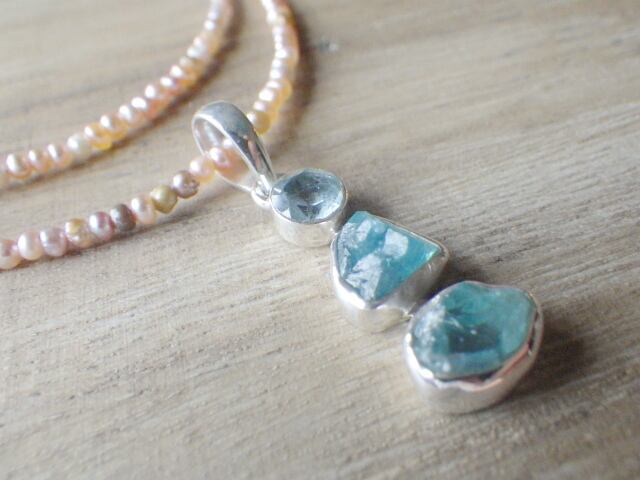 可愛いらしい薄いピーチピンクの淡水パールをネックレスにして合わせてみました。ピーチピンクと薄い紫の濃淡がある淡水パールがアパタイトとトパーズのブルーとのコントラストが素敵です。トップは外せるようにしておりますので、淡水パールネックレスだけでも素敵ですし、トップにお手持ちのチェーンや革紐を通すなど、お好にお使い頂けます