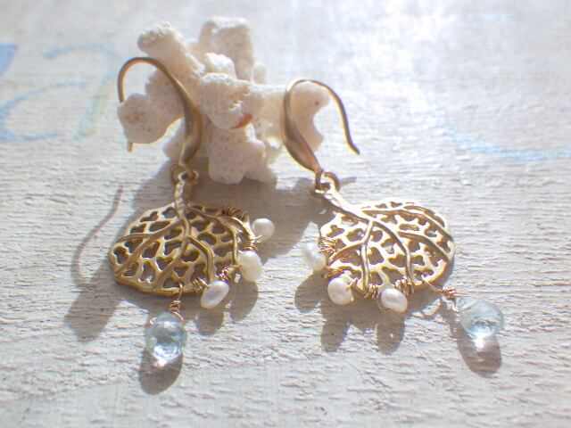 海の泡にみたてた小粒の淡水パールを施し、海の雫のようなアクアマリンをひと粒下げました