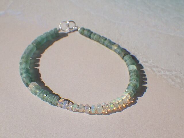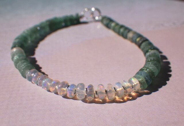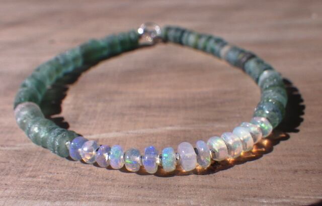 遊色のとても美しいプレシャスオパールをアクセントにしてカレンシルバーと淡いモスグリーンとグリーンのローマングラスを濃淡にして合わせ、ビューティフルなブレスレットにしました