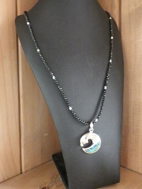 シルバーの波がうねるパウアシェルのトップがとても素敵でインパクトのあるスピネルのネックレスです