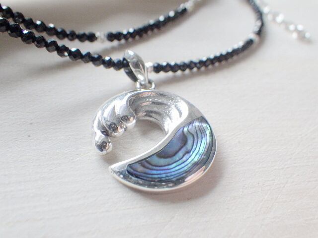 マオリ族が海の航海を見守るお守りとして用いられたパウアシェルと高品質シルバー925のトップを活かすようネックレス部分はスピネルの極小ビーズに繊細なカレンシルバーを配置しました。