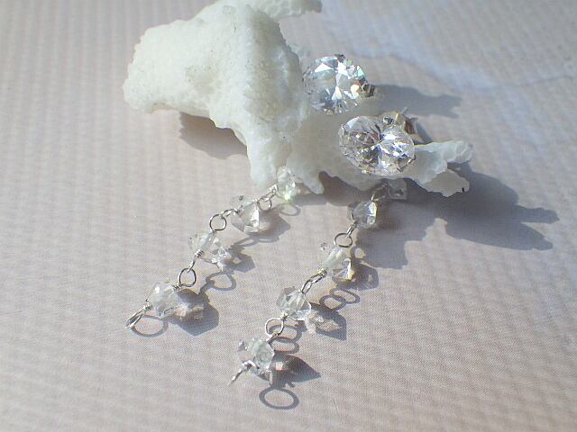 シルバー925に包まれたジルコンだけでも煌めきが素晴らしくインパクトあるのでもちろんストーンのみのスタッドピアスとしてもお使い頂けますし、写真のようにハーキマーを垂らしたスィングピアスにすると氷の粒が溢れ落ちているようでロマンティックでとても素敵です