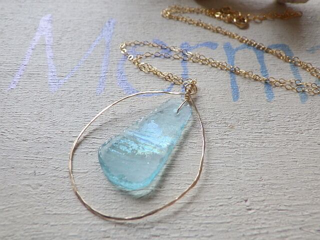 海のようなアクアシーブルーに銀化した表面の虹色がとっても味があるので活かすために、ゴールドフィルドのワイヤーをハンマーで叩いた雫方フープと合わせて揺れるネックレスにしました