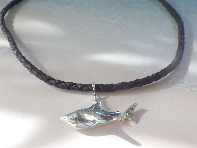 マオリ族が海の航海を見守るお守りとして用いられたパウアシェルを施した高品質シルバー925の鮫ちゃんを用いてナチュラルな色合いの網革紐のペンダントにしました