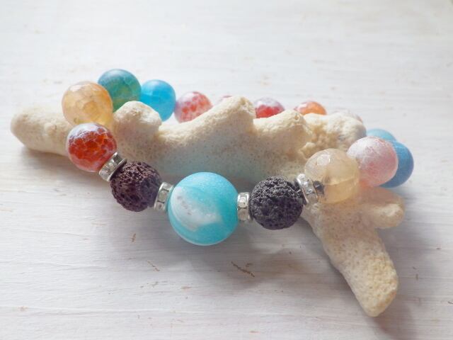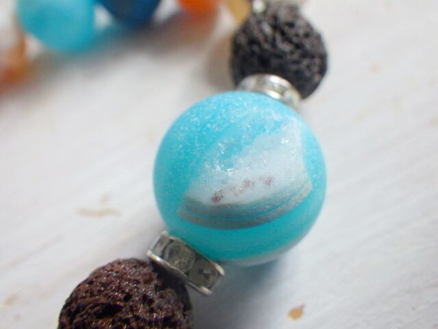 ハワイの海を思わせる色のドゥルージーアゲートを真ん中にして溶岩石であるラヴァストーンや夕日色のドラゴンアゲートなどを組みあわせアロマ/ディフューザーブレスレットにしました