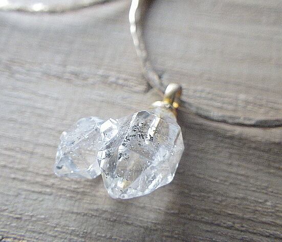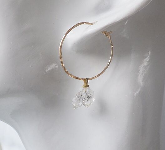 とても珍しい二つのダブルポインテッドクォーツが合わさったようや型のハーキマー型両剣水晶をゴールドフィルドワイヤーで作ったフープピアスに下げました。氷のカケラが耳元で輝くようです