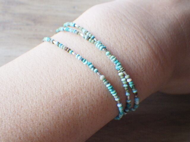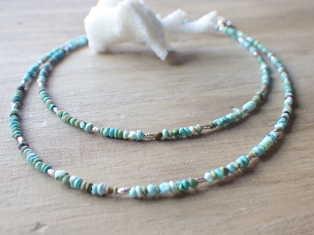 原石をそのまま切り取ったような紫のラフロック。荒削りな鉱物感とフェミニンなお色が魅力で海を思わせるターコイズの鮮やかなブルーとの相性も抜群で最高に味があります。とっても古いアフガニスタン産のトルコ石は手作業で細かなビーズにされたもの。ナチュラルでビーチィな色あいにはなんとも言えない味があります。カレンシルバーを散りばめて爽やかな仕上がりのネックレスになりました