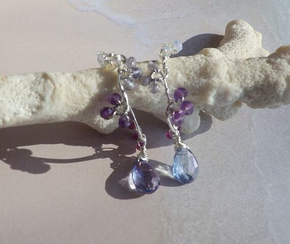 シルバー925ワイヤーを枝のようにみたてて、フープを作りプレシャスオパール、アイオライト、アメジスト、ピンクサファイアのお花を咲かせ、ミスティッククウォーツの水滴を垂らしました