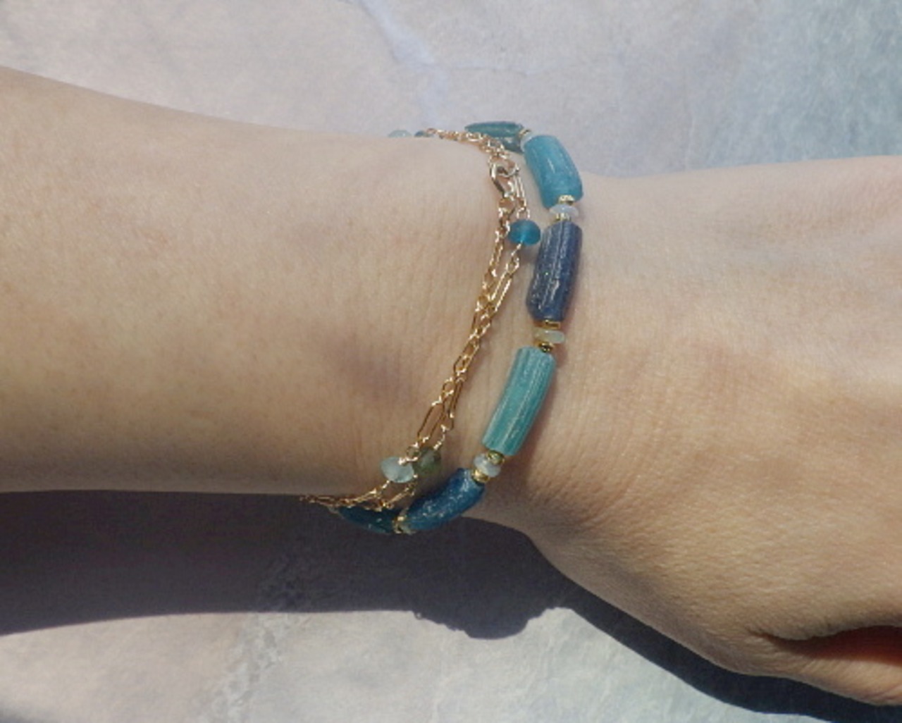 海のグラデーションのような深いブルーのローマングラスとオパールをふんだんに使用したブレスレットとシーグラスのようなローマングラを散りばめた14kgfチェーンブレスレットの2つのブレスレットのセットです
