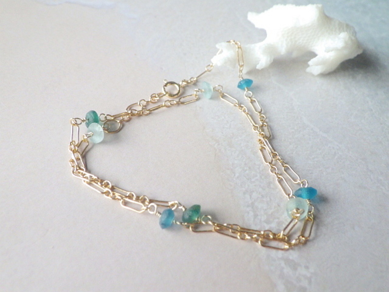 もう一つのローマングラスを散りばめたゴールドフィルドチェーンブレスレットはブレスレットにする場合は2連にしてお使い下さい。しっかりとした高級感ある14kgfチェーンを使用しました。これ一つでもさりげなくて素敵ですが重ねづけするとさらに海を感じて頂けると思います