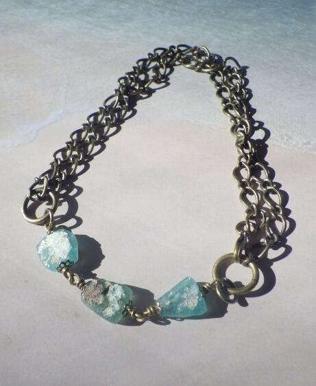 とした海色のシーグラスのようなローマングラスのボヘミアンで素朴且つクールなブレスです