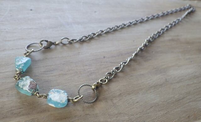 少しづつ色もカタチも違うローマングラスを3つ並べて真鍮チェーン輪っかに通しローマングラスの横の輪にカニカンを留めるデザインです