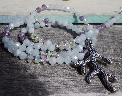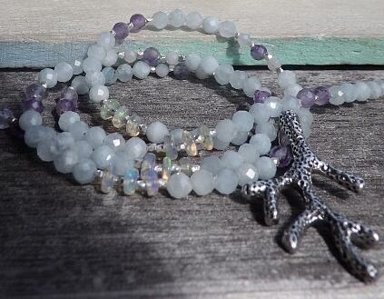アクアマリンとカレンシルバーを交互に並べ美しいプレシャスオパールとアメジストを散りばめて、淡い寒色のコントラストが美しいネックレスに仕上がりました。小粒ながら見事なダイヤモンドカットが施されたアクアマリンとアメジストはキラキラと輝き、とってもビューティフル!