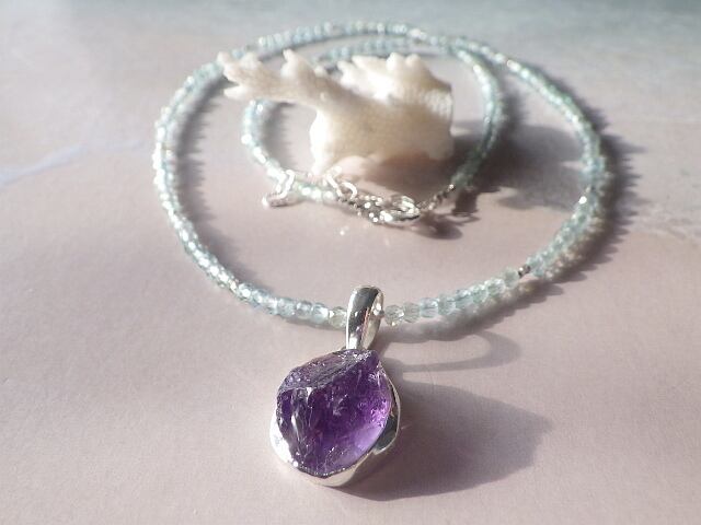 クオリティ高いシルバー925で包んだ美しいアメジストのラフロックに海のようなアパタイトのビーズを合わせネックレスにしました