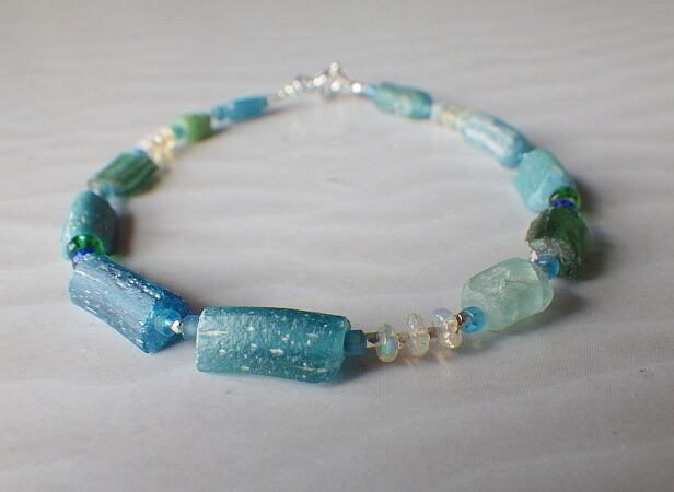 海のグラデーションのような深いブルーのローマングラスとプレシャスオパールとアンティークビーズのブレスレットです