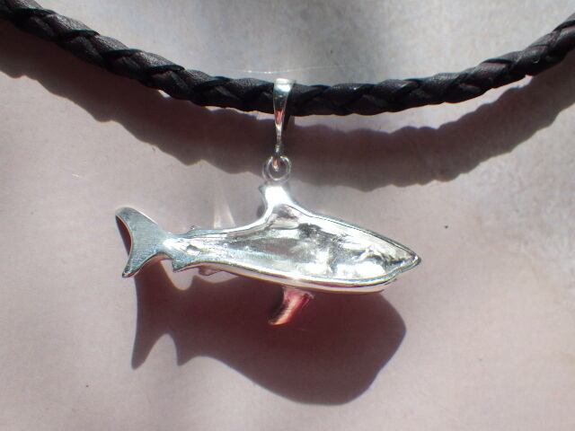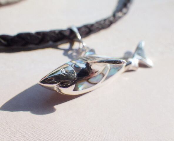 マオリ族が海の航海を見守るお守りとして用いられたパウアシェルを施した高品質シルバー925の鮫ちゃんを用いて焦茶色の革紐のペンダントにしました