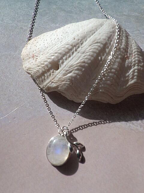 丁寧にシルバー925でフレーミングされた大粒のムーンストーンひと粒で存在感抜群です。ツルンとしたスムースカットのムーンストーンに海藻のモチーフを添えて海の香りのするシンプルなネックレスに仕上げました