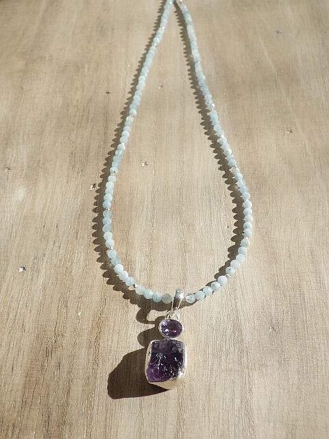 クオリティ高いシルバー925ベゼルで包まれたラフロックアメジストと美しいカットのアメジストが連なるデザインのトップに
