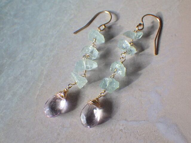 とても美しいアクアマリンの原石を繋げてピンクアメジストを下げたピアスです