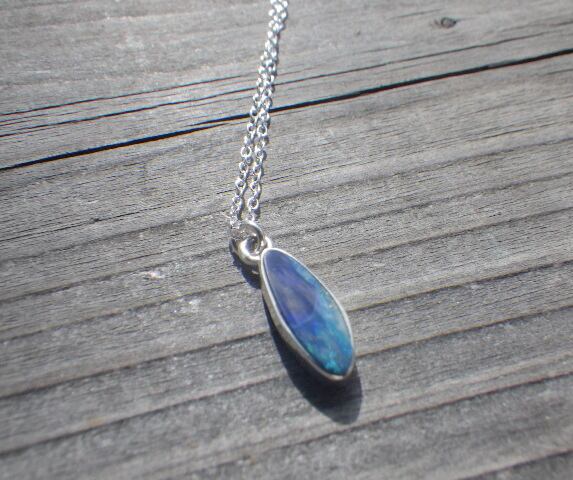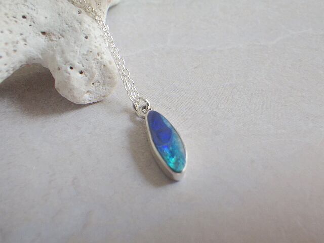 シルバー925で包み、加工したダブレットオパールの美しさを活かすため敢えてシンプルなひと粒だけのネックレスにしました