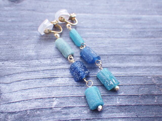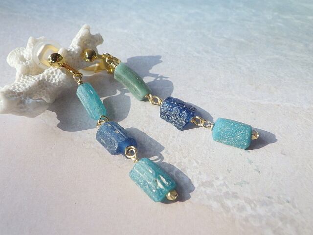 それぞれ異なるブルーのローマングラスを海のオンブレ(グラデーション)にした爽やかかつ味わいのあるクリップタイプのイヤリングです