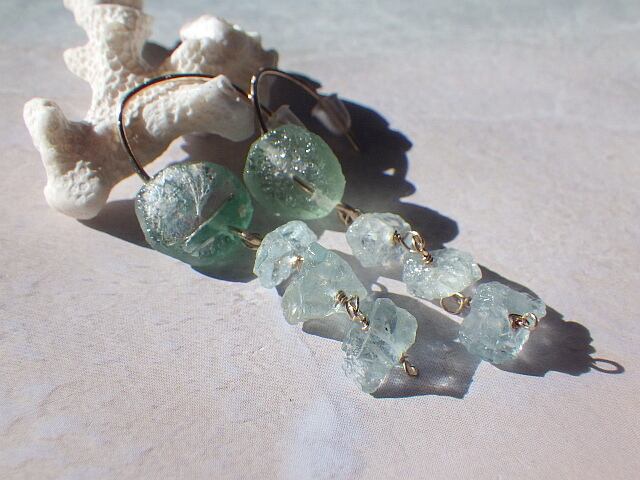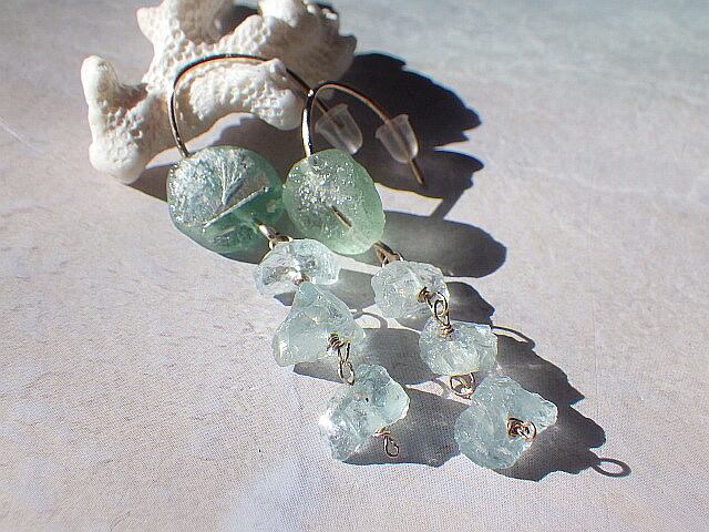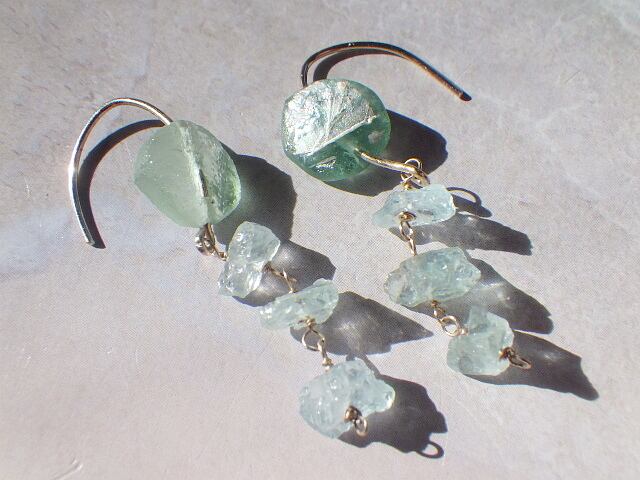 とっても綺麗なアクア色のローマングラスに美しいアクアマリンの原石が連なる爽やかなピアスです