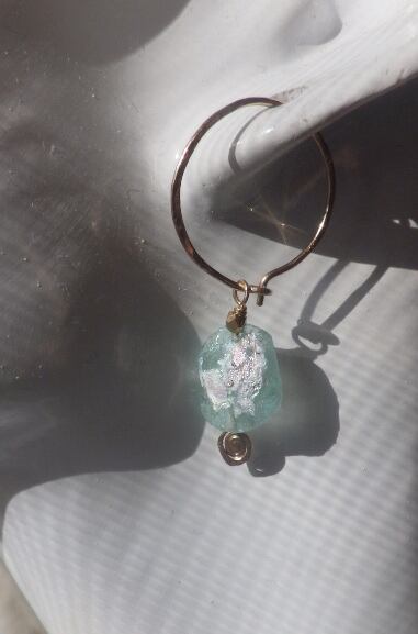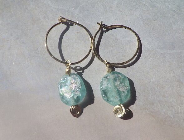ゴールドの渦巻きが可愛らしい古代ローマングラスの14kgfフープピアスです