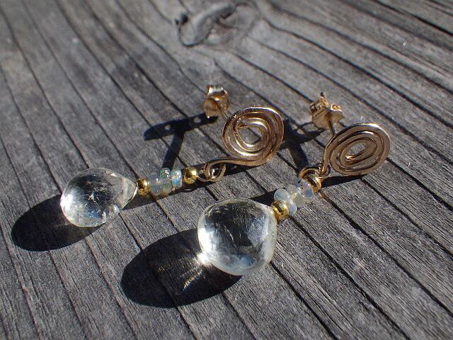 耳朶で輝く渦巻きからプレシャスオパールとグリーンアメジストが落ちるロマンティックなピアスにしました