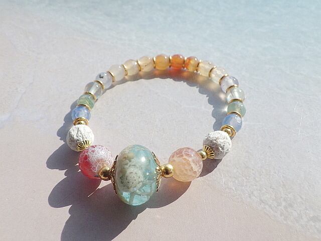 サンセットを思わせる夕日色のアゲートと海のようなブルーやグリーン色のアゲートをグラデーションにしてつなぎました