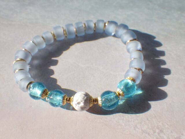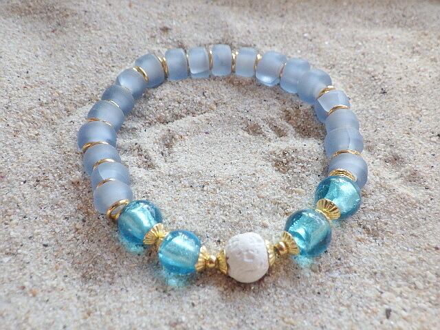 目の覚めるような綺麗なブルーのガラスビーズはアクアマリンカラーにシルバーフォイルが入って、海のようなとても爽やかなブルー