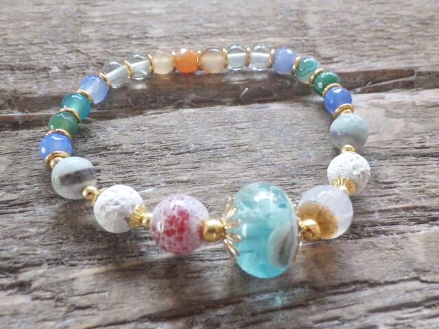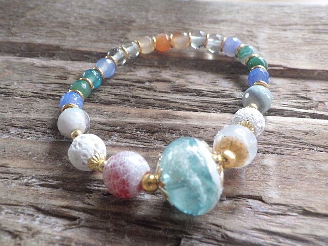 サンセットを思わせる夕日色のアゲートと海のようなブルーやグリーン色のアゲートをつなぎました