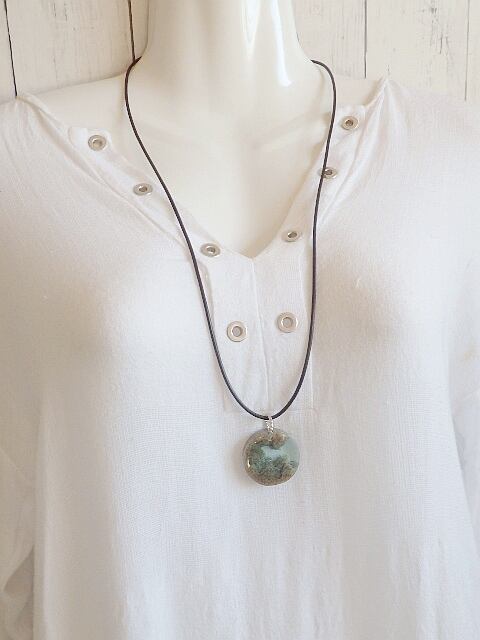 革紐のロングネックレスでシンプルなお洋服のちょっとユニークで洒落たアクセントになります