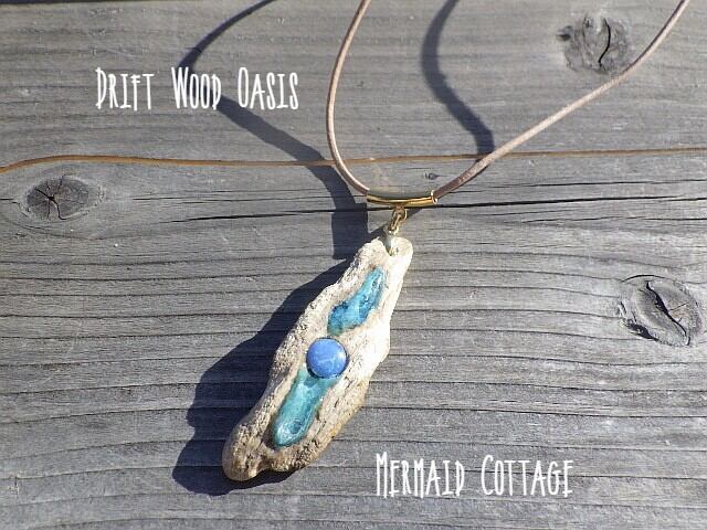 オーストラリアの丸いオパールを埋め込み、サイドにはアクリル絵の具を重ね樹脂で作った美しいブルーグリーンの水溜り。美しいブルーの重なる色合いがナチュラルな流木に映えビーチィ感といいますか、オアシス感出てます
