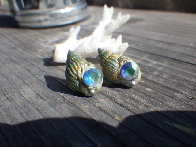 シェルの空洞の部分に加工してとても美しい色合いのスワロフスキーを埋めました