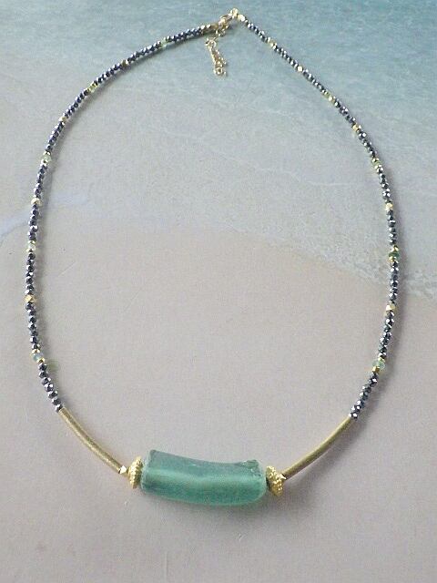 深いアクアグリーンがとても美しいローマングラスとスピネルをふんだんに使ってスペシャルなネックレスにしました