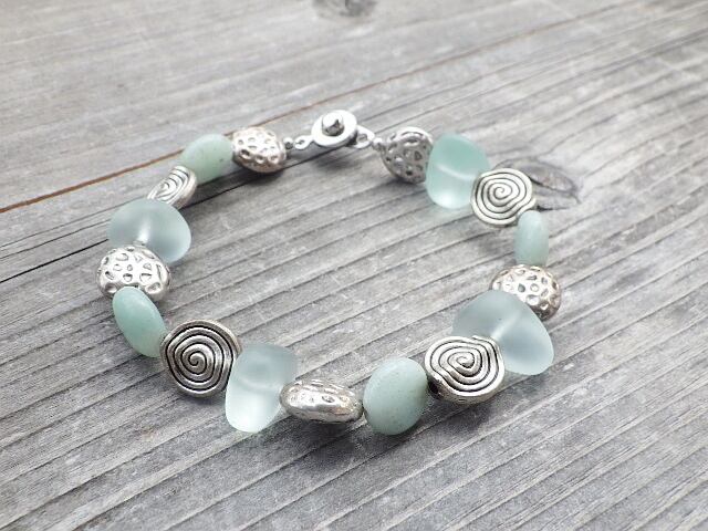 海を感じさせるシーグラス風加工ガラスにボコボコと穴が開いたような海の生物モチーフと渦巻きのモチーフ、そしてコインシェイプのアマゾナイトを合わせて潮の香りのするブレスレットにしました