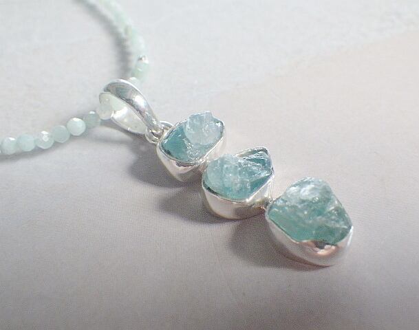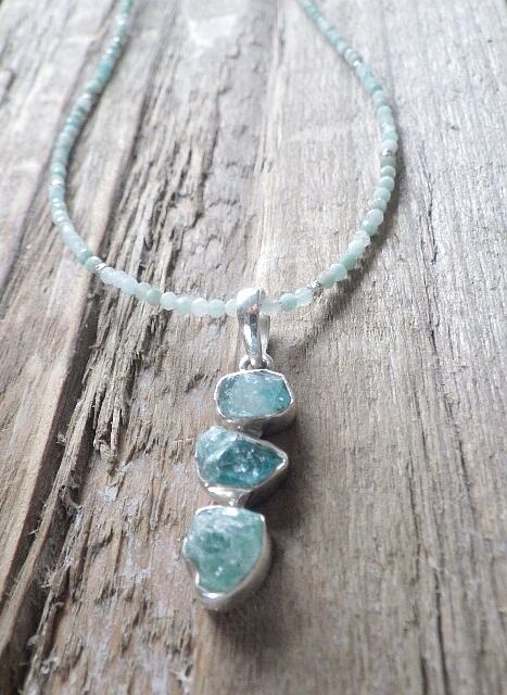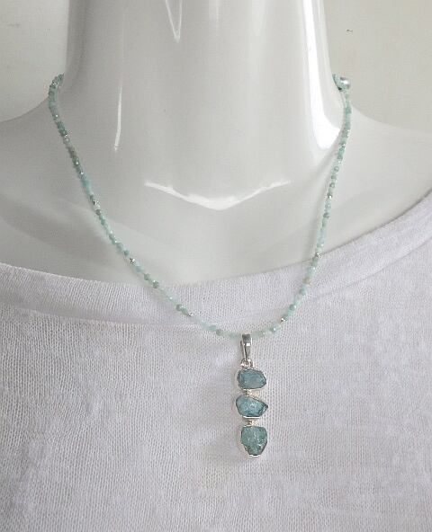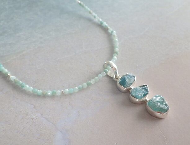 海のようなブルーのアパタイトのラフロックとアマゾナイトのビーズをふんだんに使用したスペシャルなネックレスです
